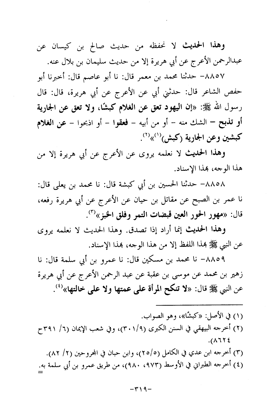 8857- حَدَّثنا مُحَمد بن مَعْمَر، قَال: حَدَّثنا أَبُو عَاصِم، قال: أَخْبَرنا أَبُو حفص الشاعر قال: حدثني أبي، عَن الأَعرَج، عَن أبي هُرَيرة، قَالَ: قَالَ رَسُول اللهِ صَلَّى اللَّهُ عَلَيه وَسَلَّم: إن اليهود تعق عن الغلام كبشا، ولاَ تعق عن الجارية، أو تذبح، الشك منه، أو من أبيه، فعقوا، أو اذبحوا عن الغلام كبشين، وعَن الجارية كبش.