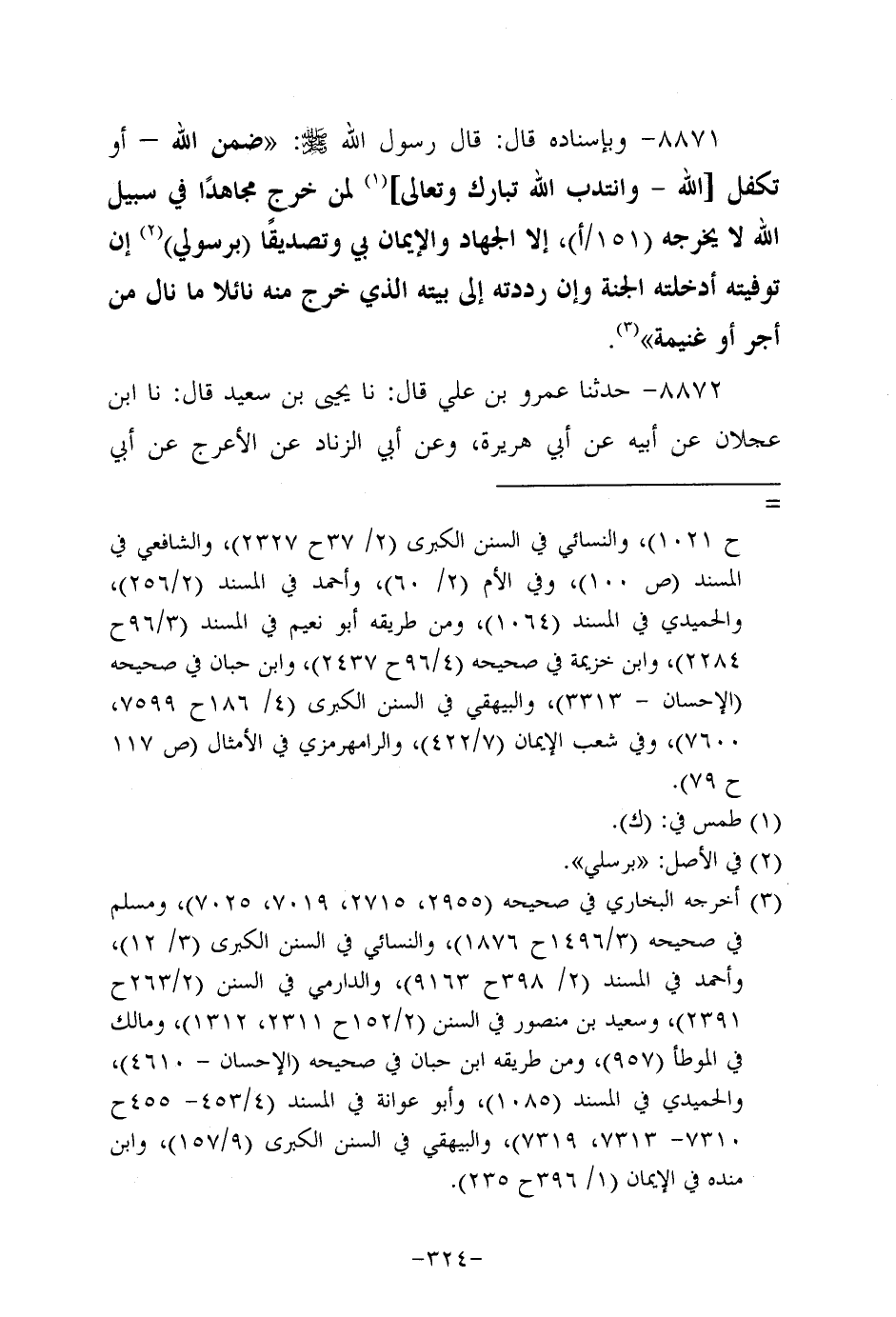 8871- وَبِإِسْنَادِهِ قَالَ: قَالَ رَسُول اللهِ صَلَّى اللَّهُ عَلَيه وَسَلَّم: ضمن الله، أو تكفل الله وانتدب الله تبارك وتعالى لمن خرج مجاهدا في سبيل الله لا يخرجه إلاَّ الجهاد والإيمان بي وتصديقا برسولي إن توفيته أدخلته الجنة، وَإن رددته إلى بيته الذي خرج منه نائلا ما نال من أجر، أو غنيمة.