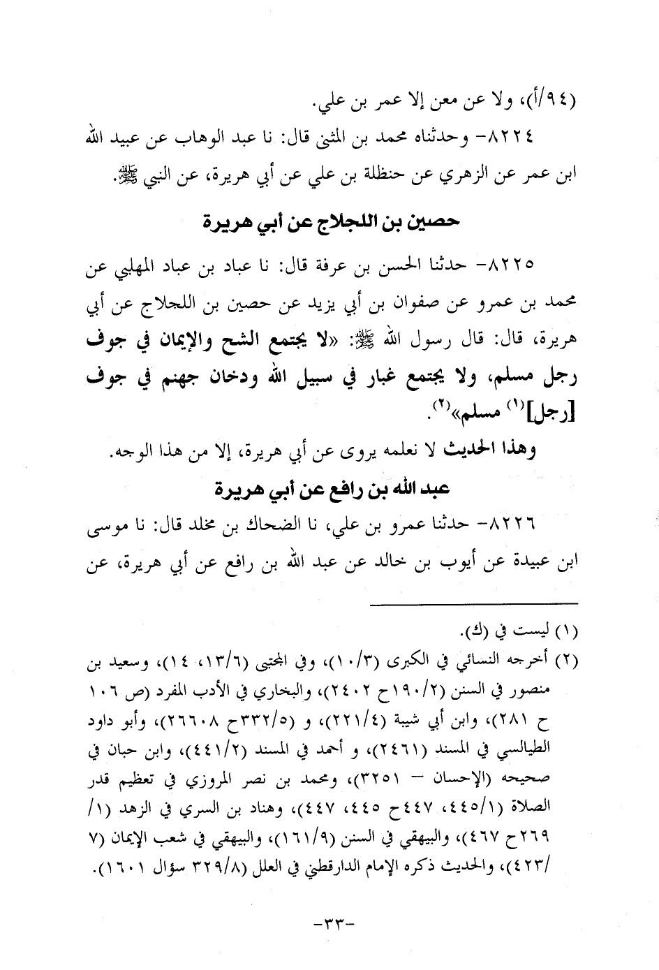 8225- حَدَّثَنَا الْحَسَنُ بْنُ عَرَفَةَ، قَال: حَدَّثنا عباد بن عباد المهلبي عن مُحَمد بن عَمْرو، عَن صفوان بن أبي يزيد عن حصين بن اللجلاج، عَن أبي هُرَيرة، قَالَ: قَالَ رَسُول اللهِ صَلَّى اللَّهُ عَلَيه وَسَلَّم: لا يجتمع الشح والإيمان في جوف رجل مسلم، ولاَ يجتمع غبار في سبيل الله ودخان جهنم في جوف رجل مسلم.