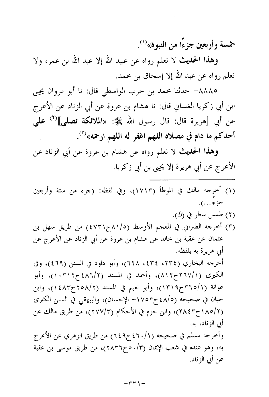 8885- حَدَّثنا مُحَمد بن حرب الواسطي، قَال: حَدَّثنا أَبُو مروان يَحيَى بن أبي زكريا الغساني، قَال: حَدَّثنا هشام بن عروة، عَن أبي الزِّنَاد، عَن الأَعرَج، عَن أبي هُرَيرة، قَالَ: قَالَ رَسُول اللهِ صَلَّى اللَّهُ عَلَيه وَسَلَّم: الملائكة تصلي على أحدكم ما دام في مصلاه اللهم اغفر له اللهم ارحمه.