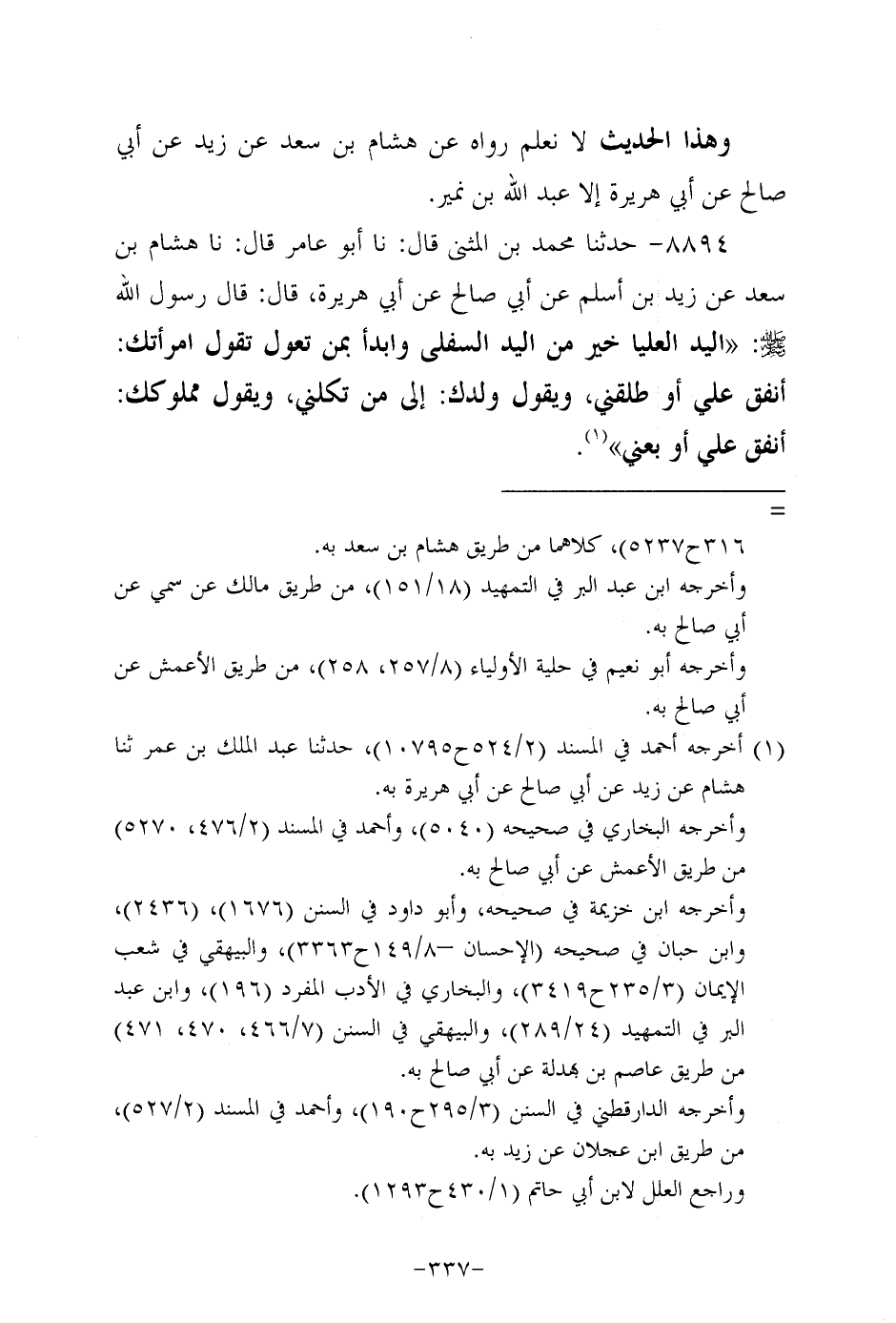 8894- حَدَّثَنا مُحَمَّدُ بْنُ الْمُثَنَّى، قَال: حَدَّثنا أَبُو عامر، قَال: حَدَّثنا هِشَامُ بْنُ سَعْد، عَن زَيد بْنِ أَسْلَمَ، عَن أبي صالح، عَن أبي هُرَيرة، قَالَ: قَالَ رَسُول اللهِ صَلَّى اللَّهُ عَلَيه وَسَلَّم: الْيَدُ الْعُلْيَا خَيْرٌ مِنَ الْيَدِ السُّفْلَى وابدأ بمن تعول تقول امرأتك: أنفق علي، أو طلقني ويقول ولدك: إلى من تكلني ويقول مملوكك: أنفق علي، أو بعني.