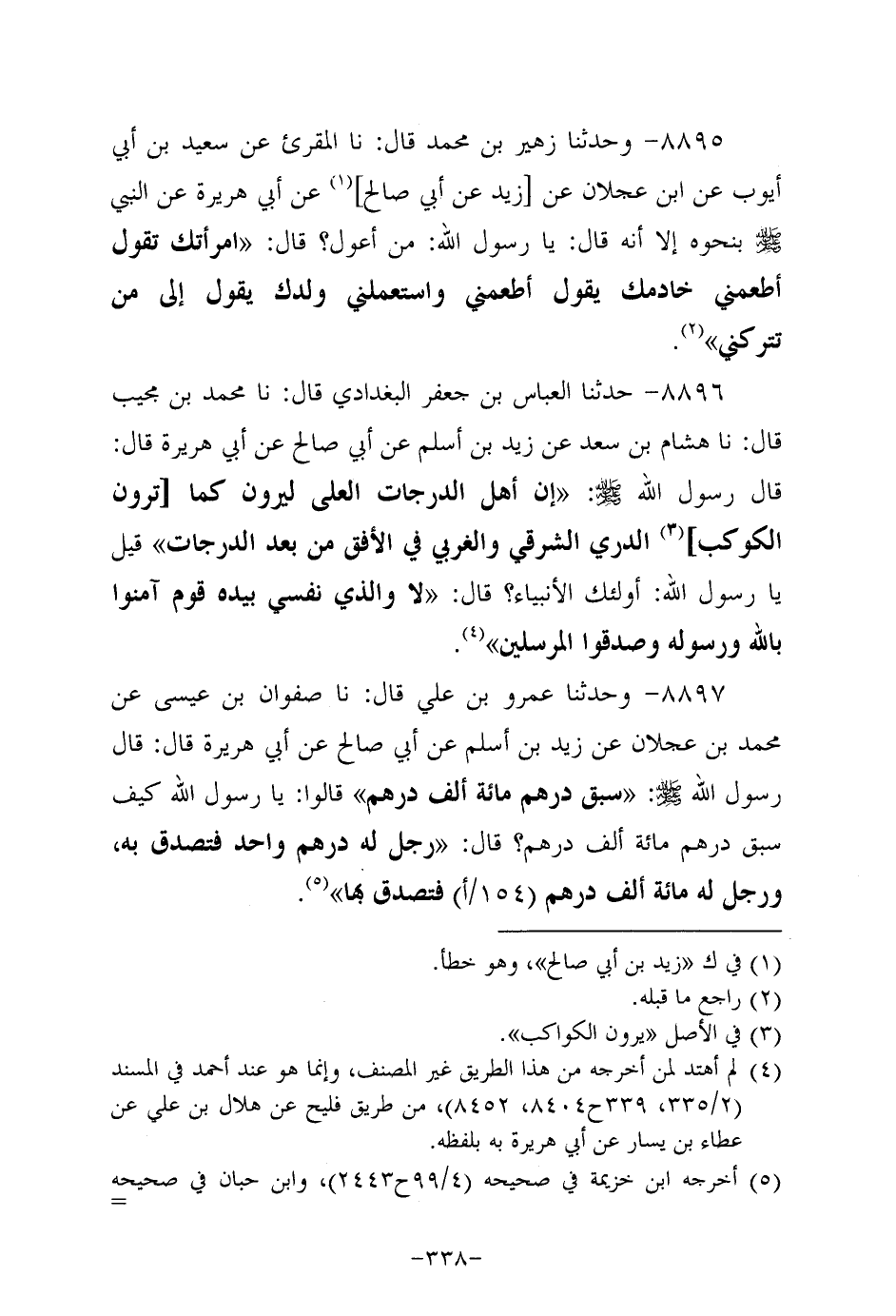 8897- وحَدَّثَنا عَمْرُو بْنُ عَلِيٍّ، قَال: حَدَّثنا صفوان بن عيسى عن مُحَمد بن عَجْلان، عَن زَيد بن أسلم، عَن أبي صالح، عَن أبي هُرَيرة، قَالَ: قَالَ رَسُول اللهِ صَلَّى اللَّهُ عَلَيه وَسَلَّم: سبق درهم مِئَة ألف درهم قالوا: يا رَسولَ اللهِ كيف سبق درهم مِئَة ألف درهم؟ قال: رجل له درهم واحد فتصدق به ورجل له مِئَة ألف درهم فتصدق بها.