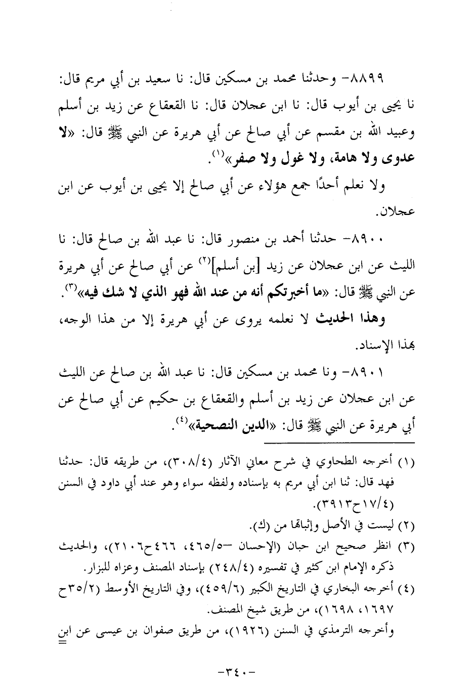 8901- وحدثنا مُحَمد بن مسكين، قَال: حَدَّثنا عَبد الله بن صالح، عَن اللَّيْث، عَن ابن عَجْلان، عَن زَيد بن أسلم والقعقاع بن حكيم، عَن أبي صالح، عَن أَبِي هُرَيرة، عَن النَّبِيّ صَلَّى اللَّهُ عَلَيه وَسَلَّم قال: الدين النصيحة.