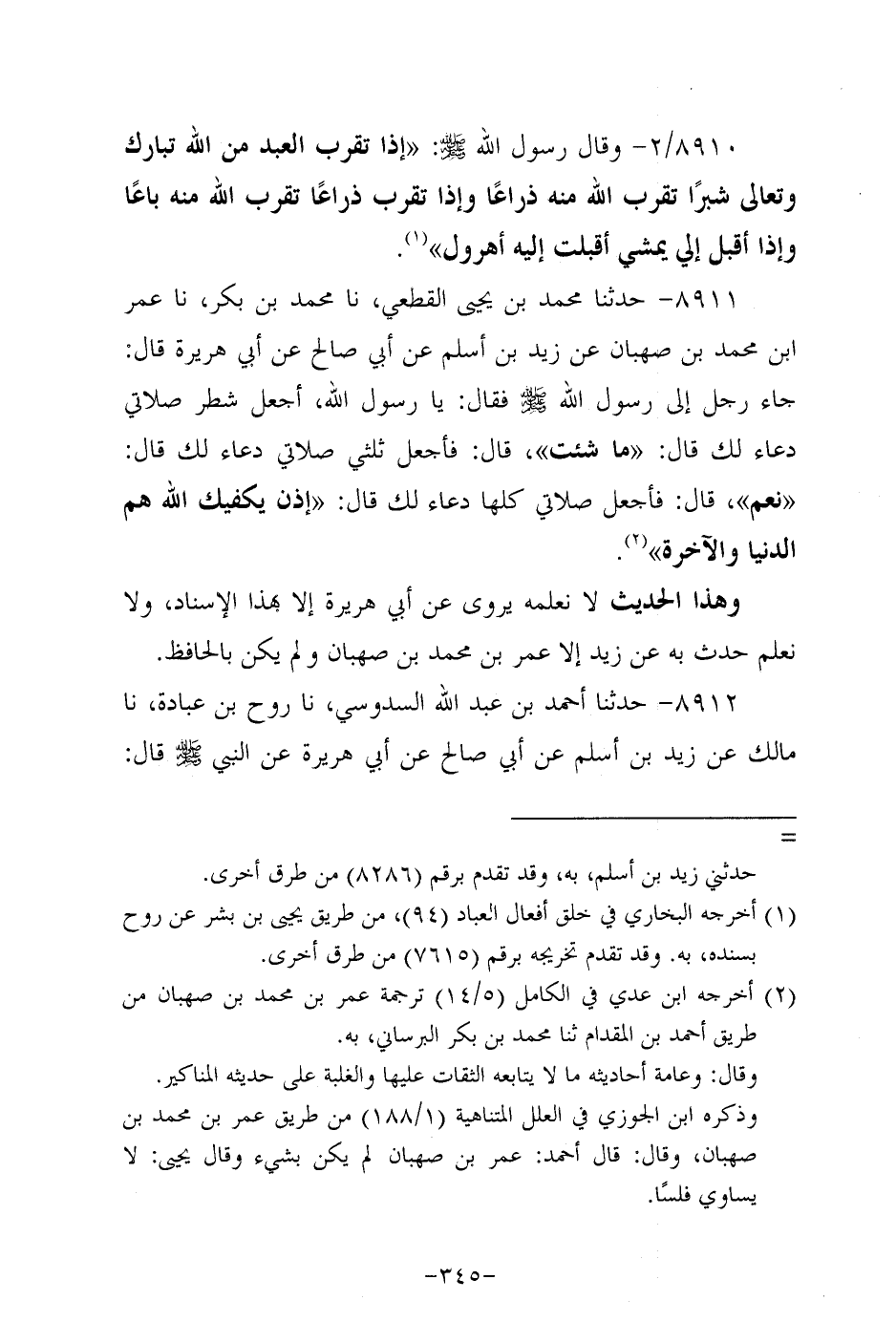 8911- حَدَّثنا مُحَمد بن يحيى القطعي حَدَّثنا مُحَمد بن بكر حَدَّثنا عُمَر بن مُحَمد بن صهبان، عَن زَيد بن أسلم، عَن أبي صالح، عَن أبي هُرَيرة، قَالَ: جَاءَ رَجُلٌ إِلَى رَسُولِ اللَّهِ صَلَّى اللَّهُ عَلَيه وَسَلَّم فَقَالَ: يَا رَسولَ اللهِ أجعل شطر صلاتي دعاء لك قال: ما شئت قال: فأجعل ثلثي صلاتي دعاء لك قال: نعم قال: فأجعل صلاتي كلها دعاء لك قال: إذا يكفيك الله هم الدنيا والآخرة.