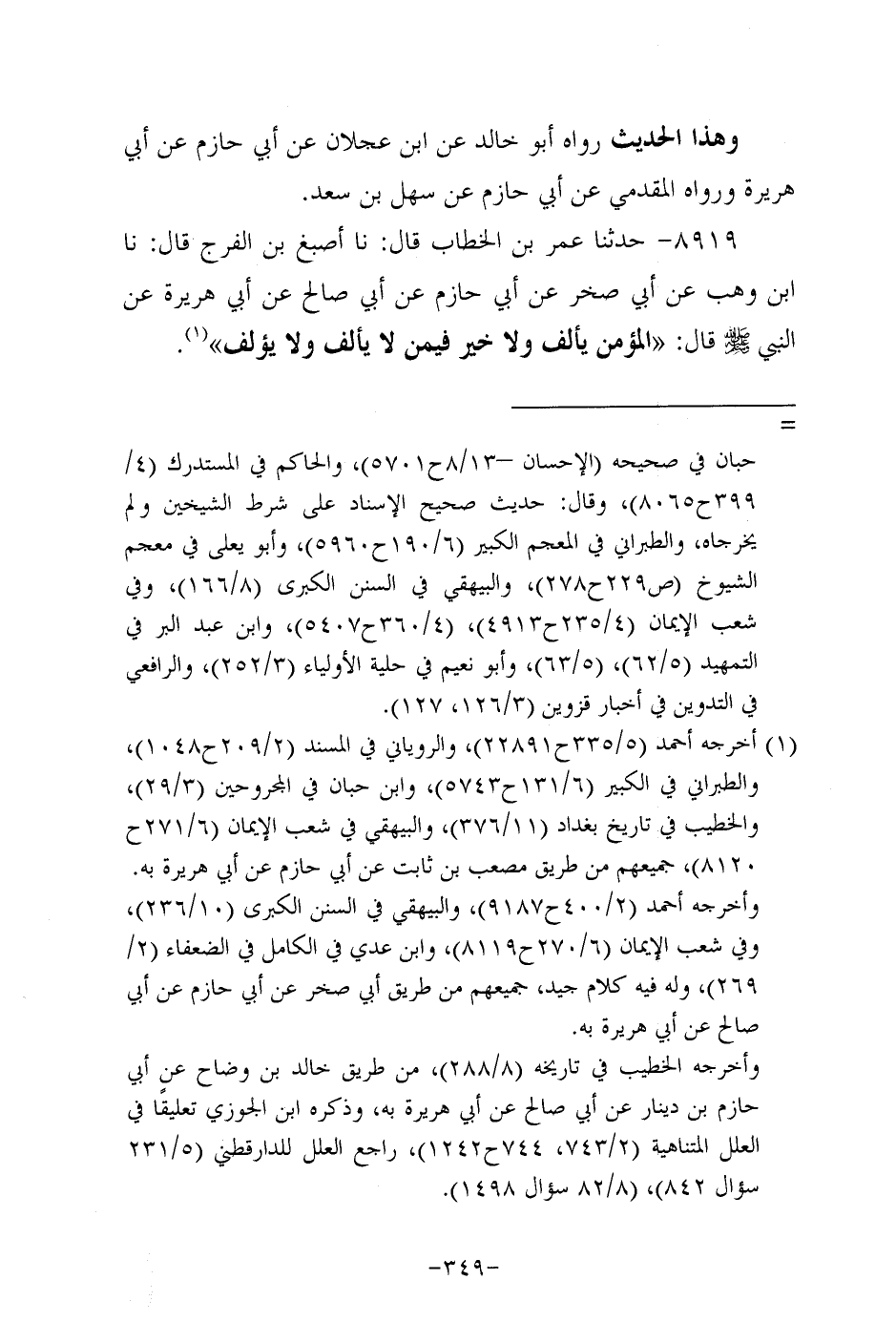 8919- حَدَّثنا عُمَر بن الخطاب، قَال: حَدَّثنا أصبغ بن الفرج، قَال: حَدَّثنا ابن وهب، عَن أبي صخر، عَن أبي حازم، عَن أبي صالح، عَن أَبِي هُرَيرة، عَن النَّبِيّ صَلَّى اللَّهُ عَلَيه وَسَلَّم قال: المؤمن يألف، ولاَ خير فيمن لا يألف، ولاَ يؤلف.