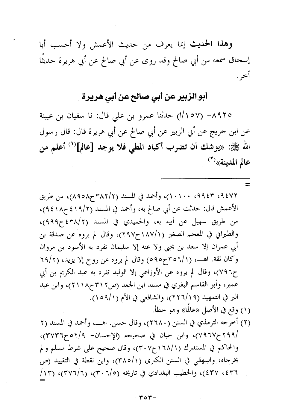 8925- حَدَّثَنا عَمْرُو بْنُ عَلِيٍّ، قَال: حَدَّثنا سفيان بن عُيَينة، عَن ابْنِ جُرَيج، عَن أَبِي الزُّبَيْرِ، عَن أبي صالح، عَن أبي هُرَيرة، قَالَ: قَالَ رَسُول اللهِ صَلَّى اللَّهُ عَلَيه وَسَلَّم: يوشك أن تضرب أكباد المطي فلا يوجد عالم أعلم من عالم المدينة.