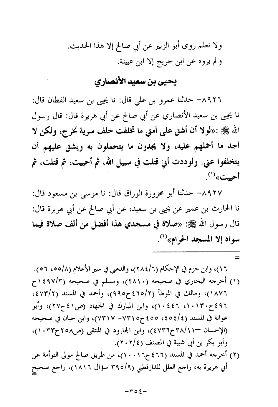 8926- حَدَّثَنا عَمْرُو بْنُ عَلِيٍّ، قَال: حَدَّثنا يحيى بن سَعِيد القطان، قَال: حَدَّثنا يحيى بن سَعِيد الأنصاري، عَن أبي صالح، عَن أبي هُرَيرة، قَالَ: قَالَ رَسُول اللهِ صَلَّى اللَّهُ عَلَيه وَسَلَّم: لولا أن أشق على أمتي ما تخلفت خلف سرية تخرج، وَلكن لا أجد ما أحملهم عليه، ولاَ يجدون ما يتحملون به ويشق عليهم أن يتخلفوا عني ولوددت أني قتلت في سبيل الله، ثُمَّ أحييت، ثُمَّ قتلت، ثُمَّ أحييت.