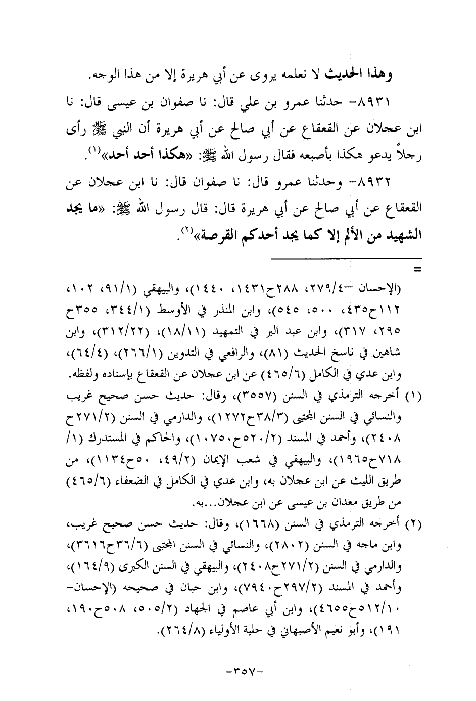 8932- وحَدَّثنا عَمْرو، قَال: حَدَّثنا صفوان، قَال: حَدَّثنا ابن عَجْلان عن القعقاع، عَن أبي صالح، عَن أبي هُرَيرة، قَالَ: قَالَ رَسُول اللهِ صَلَّى اللَّهُ عَلَيه وَسَلَّم: ما يجد الشهيد من الألم إلاَّ كما يجد أحدكم القرصة.