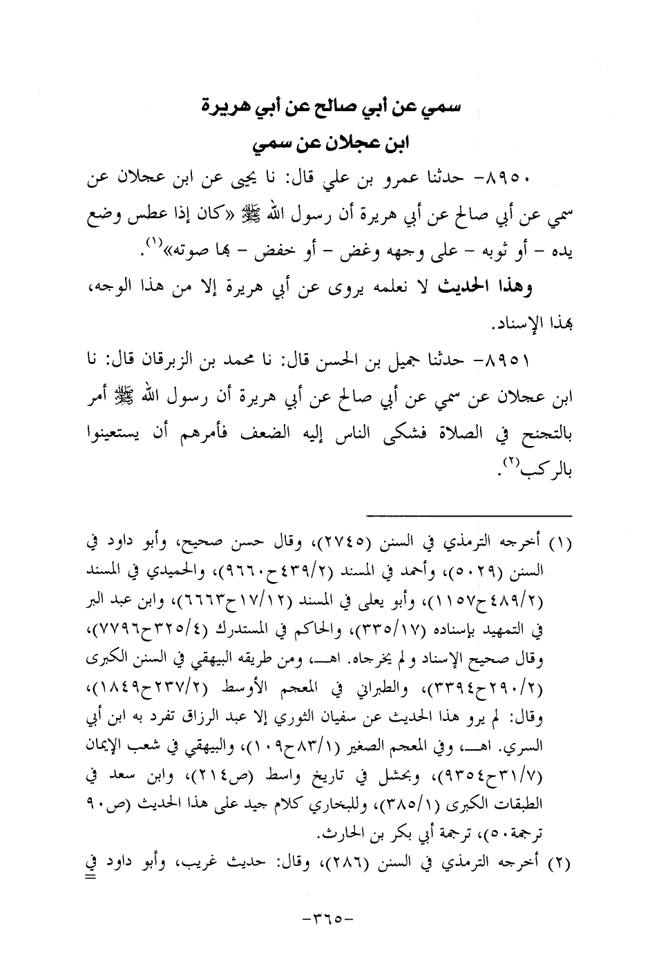 8951- حَدَّثنا جميل بن الحسن، قَال: حَدَّثنا مُحَمد بن الزبرقان، قَال: حَدَّثنا ابن عَجْلان عَنْ سُمَيّ، عَن أبي صالح، عَن أبي هُرَيرة؛ أَنَّ رَسُولَ اللهِ صَلَّى اللَّهُ عَلَيه وَسَلَّم أمر بالتجنح في الصلاة فشكى الناس إليه الضعف فأمرهم أن يستعينوا بالركب.