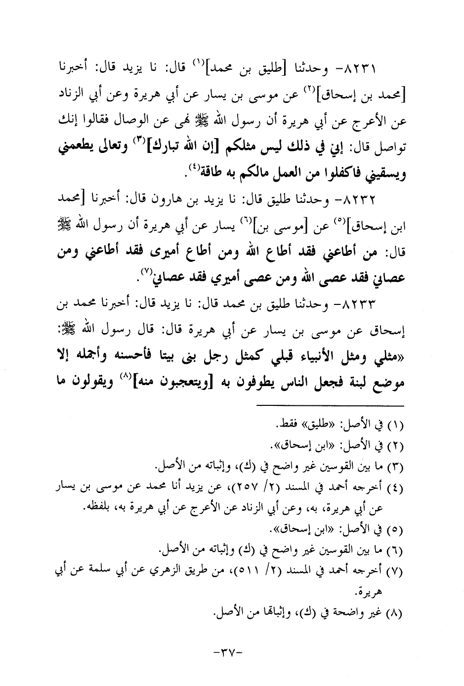 8232- وحَدَّثنا طليق، قَال: حَدَّثنا يزيد بن هارون، قال: أَخْبَرنا مُحَمد بن إسحاق، عَن موسى بن يسار، عَن أبي هُرَيرة؛ أَنَّ رَسُولَ اللهِ صَلَّى اللَّهُ عَلَيه وَسَلَّم قال: من أطاعني فقد أطاع الله، وَمَنْ أطاع أميري فقد أطاعني، وَمَنْ عصاني فقد عصى الله، وَمَنْ عصى أميري فقد عصاني.