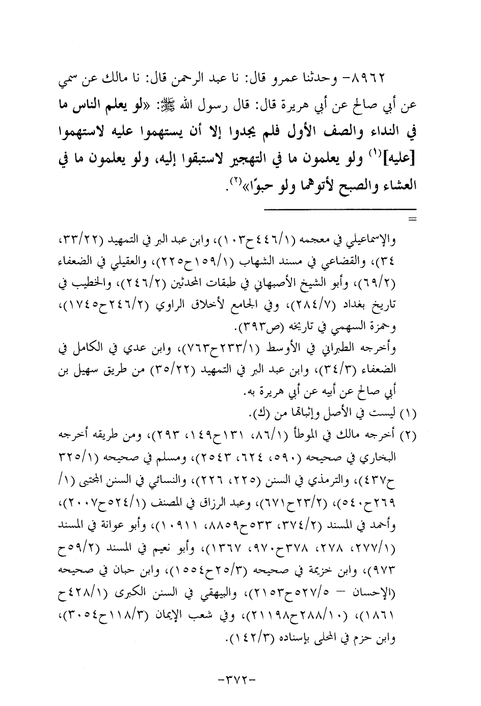 8962- وحَدَّثنا عَمْرو، قَال: حَدَّثنا عَبد الرحمن، قَال: حَدَّثنا مالك، عَن سمي، عَن أبي صالح، عَن أبي هُرَيرة، قَالَ: قَالَ رَسُول اللهِ صَلَّى اللَّهُ عَلَيه وَسَلَّم: لو يعلم الناس ما في النداء والصف الأول فلم يجدوا إلاَّ أن يستهموا عليه لاستهموا عليه، ولو يعلمون ما في التهجير لاستبقوا إليه، ولو يعلمون ما في العشاء والصبح لأتوهما، ولو حبوا.