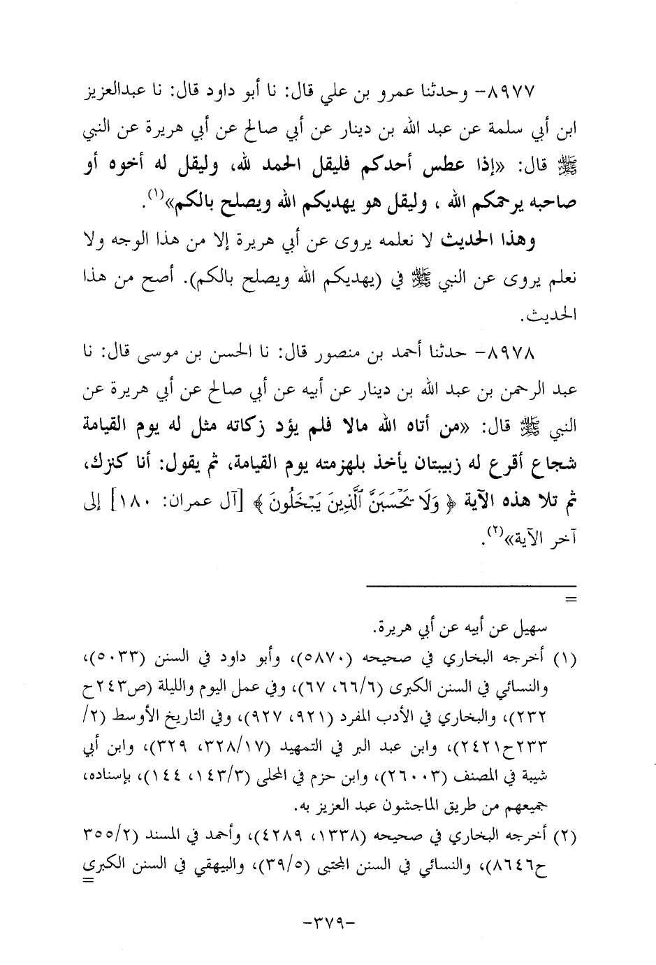 8978- حَدَّثنا أحمد بن منصور، قَال: حَدَّثنا الحسن بن موسى، قال: حَدَّثَنَا عَبْدُ الرَّحْمَنِ بْنُ عَبْد اللهِ بْنِ دِينَارٍ، عَنْ أَبِيهِ، عَنْ أَبِي صَالِحٍ، عَنْ أَبِي هُرَيْرَةَ، عَن النَّبِيّ صَلَّى اللَّهُ عَلَيه وَسَلَّم قال: مَنْ آتَاهُ اللَّهُ مَالاً فَلَمْ يُؤَدِّ زَكَاتَهُ مُثِّلَ لَهُ يَوْمَ الْقِيَامَةِ شُجَاع أَقْرَعَ لَهُ زَبِيبَتَانِ يَأْخُذُ بِلِهْزِمَتهِ يَوْمَ الْقِيَامَةِ، ثُمَّ يَقُولُ: أَنَا كَنْزُكَ، ثُمَّ تَلاَ هَذِهِ الآيَةَ {وَلَا يَحْسَبَنَّ الَّذِينَ يَبْخَلُونَ} إلى آخر الآية.