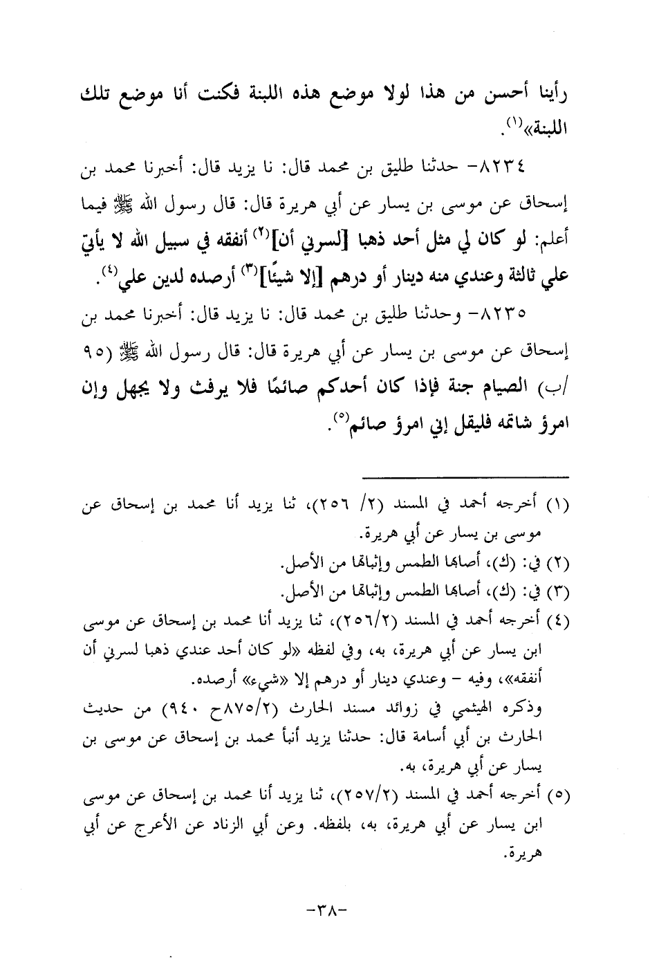 8234- حَدَّثنا طليق بن مُحَمد، قَال: حَدَّثنا يزيد، قال: أَخْبَرنا مُحَمد بن إسحاق، عَن موسى بن يسار، عَن أبي هُرَيرة، قَالَ: قَالَ رَسُول اللهِ صَلَّى اللَّهُ عَلَيه وَسَلَّم فيما أعلم: لو كان لي مثل أحد ذهبا لسرني أن أنفقه في سبيل الله , لا يأتي على ثالثة وعندي منه دينار، أو درهم , إلاَّ شيئا أرصده لدين علي.