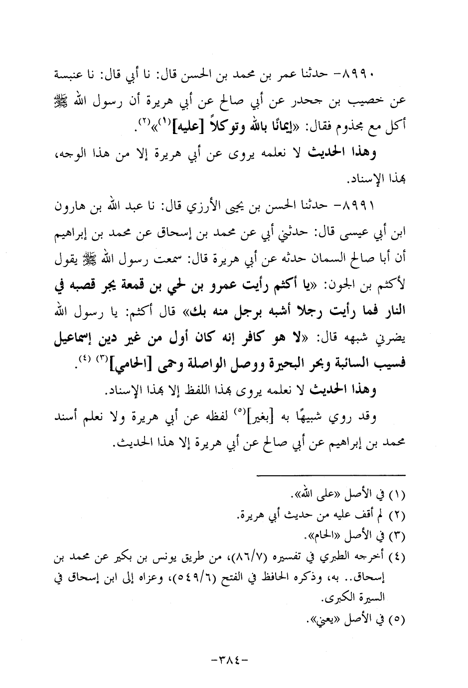 8991- حَدَّثنا الحسن بن يحيى الأرزي، قَال: حَدَّثنا عَبد الله بن هارون بن أبي عيسى قال: حدثني أبي عَنْ مُحَمد بْنِ إِسْحَاقَ، عَن مُحَمد بْنِ إبراهيم أن أبا صالح السمان حدثه، عَن أبي هُرَيرة، قَالَ: سَمِعْتُ رَسُولَ اللَّهِ صَلَّى اللَّهُ عَلَيه وَسَلَّم يقول لأكثم بن الجون: يا أكثم رأيت عَمْرو بن لحي بن قمعة يجر قصبه في النار فما رأيت رجلاً أشبه برجل منه بك قال أكثم: يا رَسولَ اللهِ يضرني شبهه؟ قَال: لاَ هو كافر إنه كان أول من غير دين إسماعيل فسيب السائبة وبحر البحيرة ووصل الواصلة وحمى الحامي.