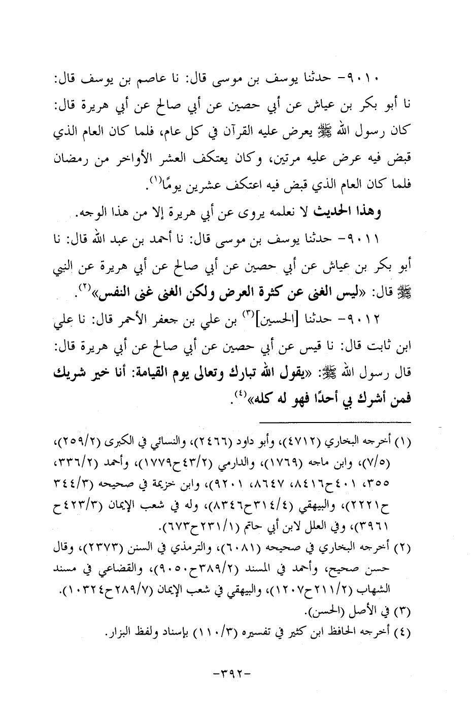 9011- حَدَّثنا يوسف بن موسى، قَال: حَدَّثنا أحمد بن عَبد الله، قَال: حَدَّثنا أَبْو بَكْر بن عياش، عَن أبي حَصِين، عَن أبي صالح، عَن أَبِي هُرَيرة، عَن النَّبِيّ صَلَّى اللَّهُ عَلَيه وَسَلَّم قال: ليس الغنى عن كثرة العرض، وَلكن الغنى غنى النفس.