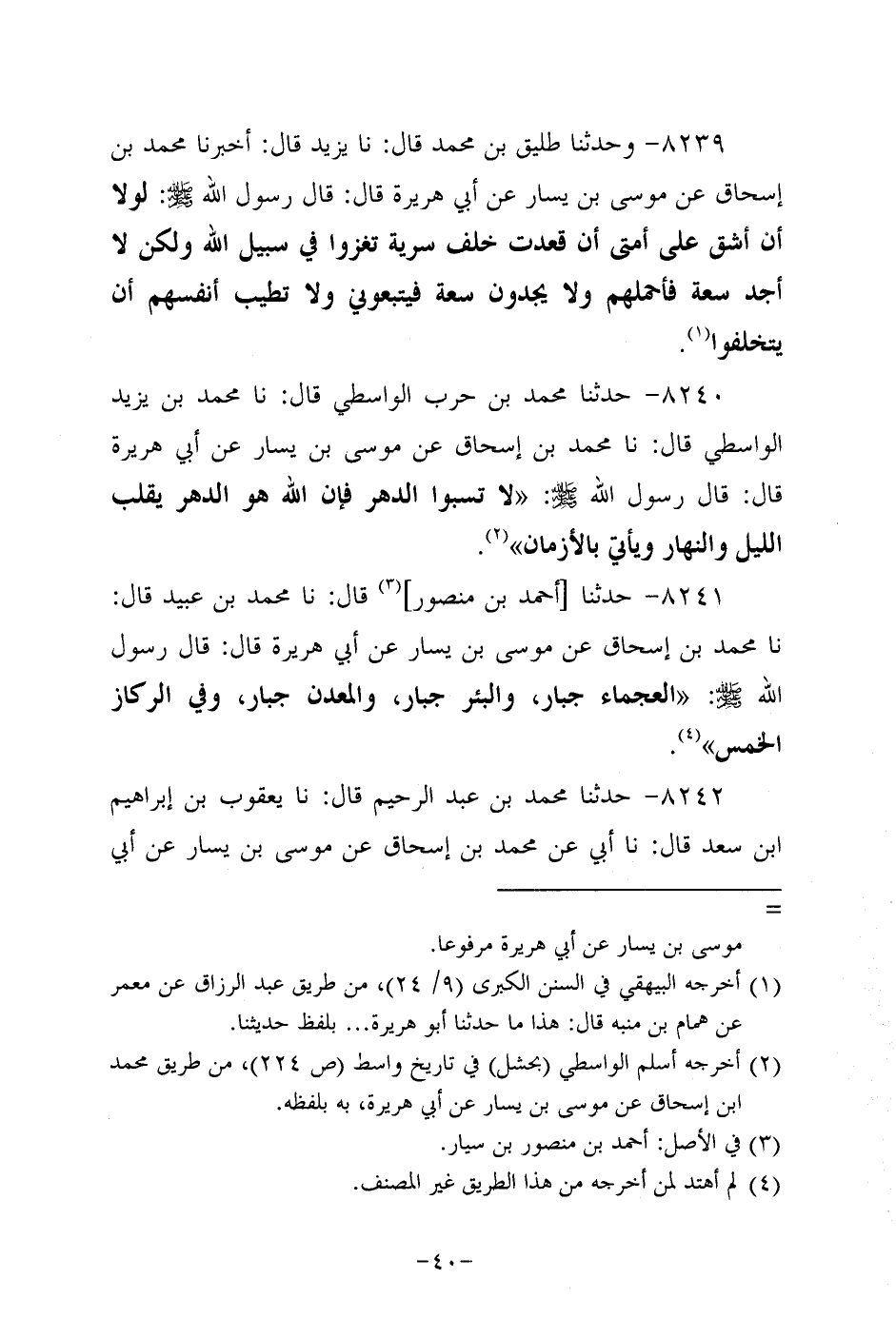 8240- حَدَّثنا مُحَمد بن حرب الواسطي، قَال: حَدَّثنا مُحَمد بن يزيد الواسطي، قَال: حَدَّثنا مُحَمد بن إسحاق، عَن موسى بن يسار، عَن أبي هُرَيرة، قَالَ: قَالَ رَسُول اللهِ صَلَّى اللَّهُ عَلَيه وَسَلَّم: لا تسبوا الدهر فإن الله هو الدهر يقلب الليل والنهار ويأتي بالأزمان.