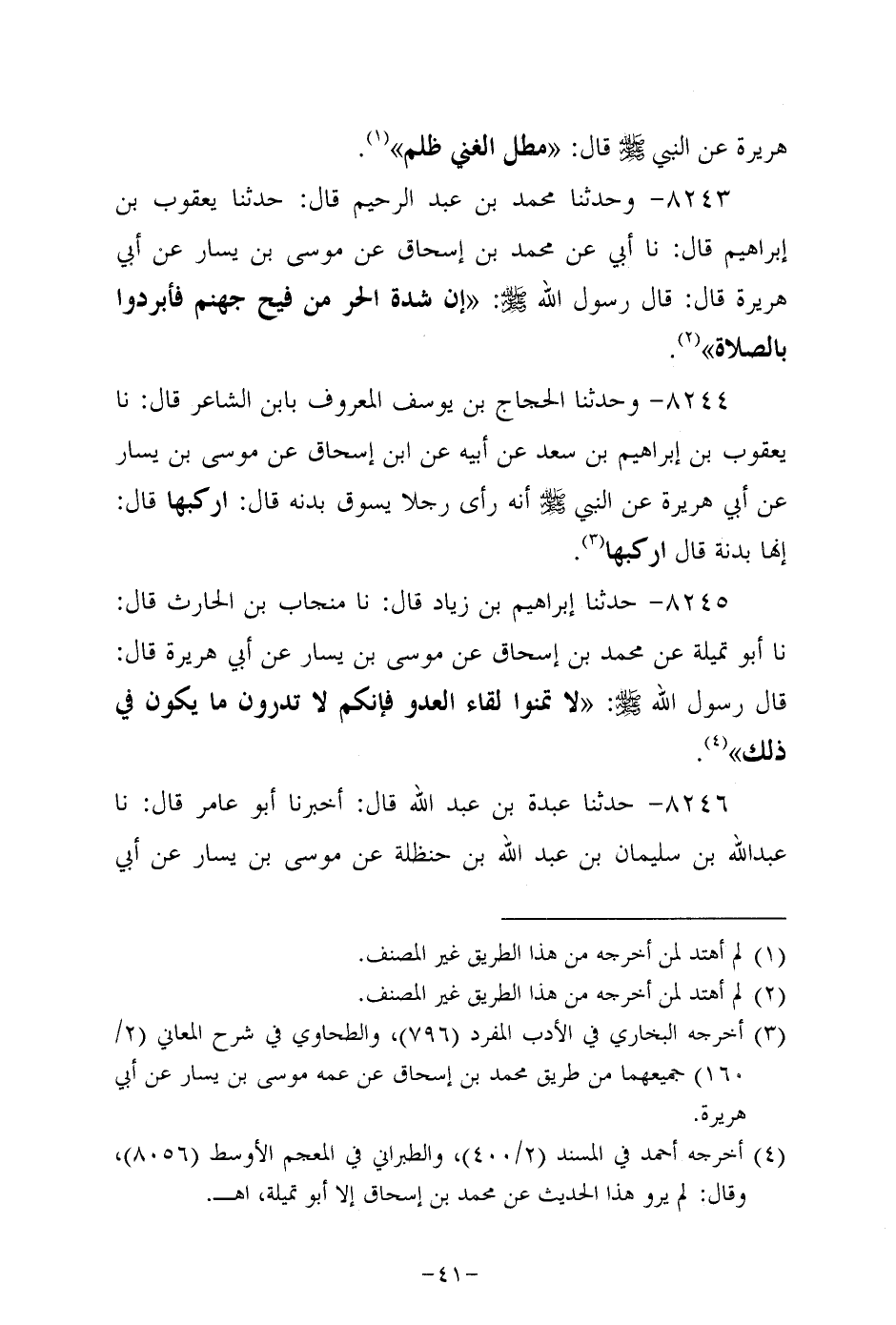 8245- حَدَّثنا إبراهيم بن زياد، قَال: حَدَّثنا منجاب بن الحارث، قَال: حَدَّثنا أَبُو تميلة عن مُحَمد بن إسحاق، عَن موسى بن يسار، عَن أبي هُرَيرة، قَالَ: قَالَ رَسُول اللهِ صَلَّى اللَّهُ عَلَيه وَسَلَّم: لا تمنوا لقاء العدو فإنكم لا تدرون ما يكون في ذلك.