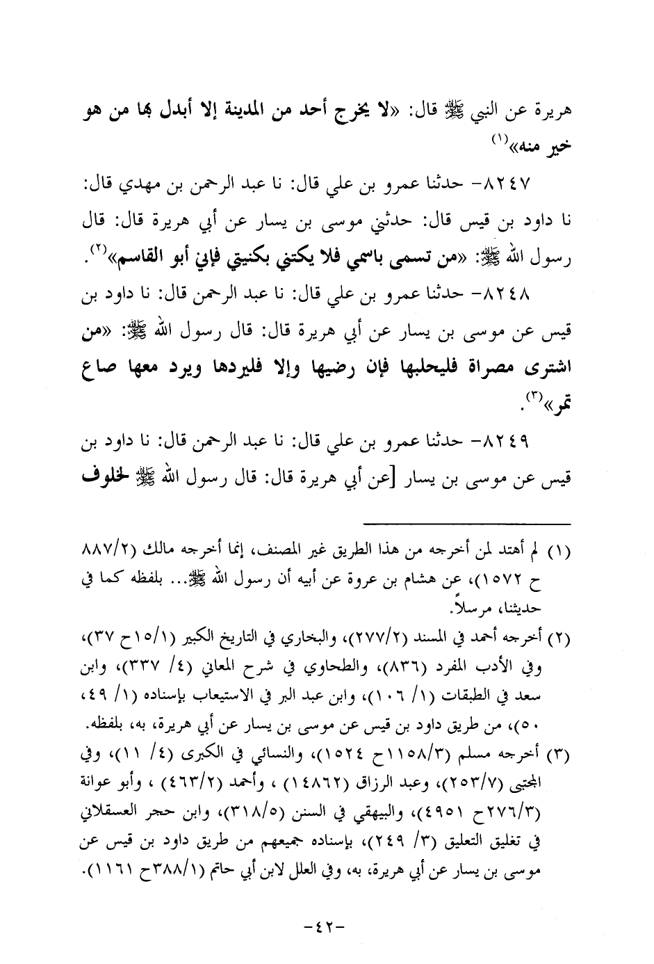 8247- حَدَّثَنا عَمْرُو بْنُ عَلِيٍّ، قَال: حَدَّثنا عَبد الرحمن بن مهدي، قَال: حَدَّثنا داود بن قيس قال: حدثني موسى بن يسار، عَن أبي هُرَيرة، قَالَ: قَالَ رَسُول اللهِ صَلَّى اللَّهُ عَلَيه وَسَلَّم: من تسمى باسمي فلا يكتني بكنيتي فإني أَبُو القاسم.