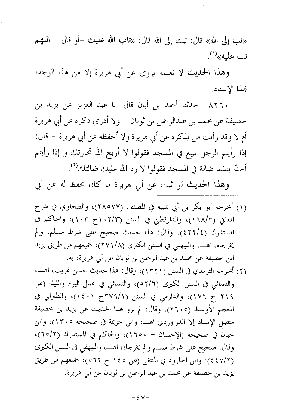 8260- حَدَّثنا أحمد بن أَبَان، قَال: حَدَّثنا عَبد العزيز عن يزيد بن خُصَيفة عن مُحَمد بن عَبد الرحمن بن ثوبان - ولاَ أدري ذكره، عَن أبي هُرَيرة أم لا وقد رأيت من يذكره، عَن أبي هُرَيرة، ولاَ أحفظه، عَن أبي هُرَيرة - قال: إذا رأيتم الرجل يبيع في المسجد فقولوا لا أربح الله تجارتك، وإذا رأيتم أَحَدًا ينشد ضالة في المسجد فقولوا لا رد الله عليه ضالتك.
