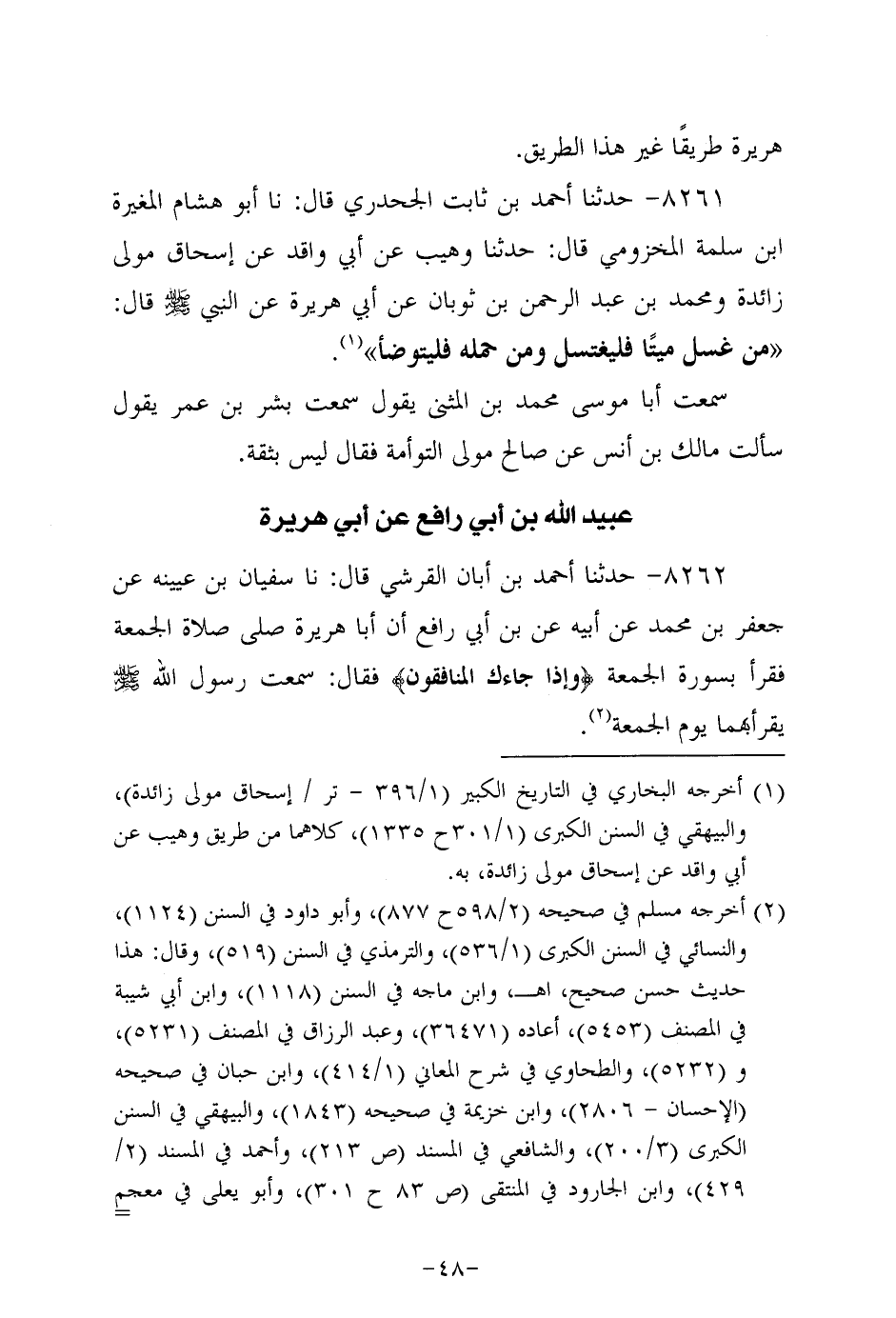 8261- حَدَّثنا أحمد بن ثابت الجحدري، قَال: حَدَّثنا أَبُو هِشَامٍ الْمُغِيرَةُ بْنُ سَلَمَةَ المخزومي، قَال: حَدَّثنا وهيب، عَن أبي واقد عن إسحاق مولى زائدة، ومُحَمد بن عَبد الرحمن بن ثوبان، عَن أَبِي هُرَيرة، عَن النَّبِيّ صَلَّى اللَّهُ عَلَيه وَسَلَّم قال: من غسل ميتًا فليغتسل، وَمَنْ حمله فليتوضأ.