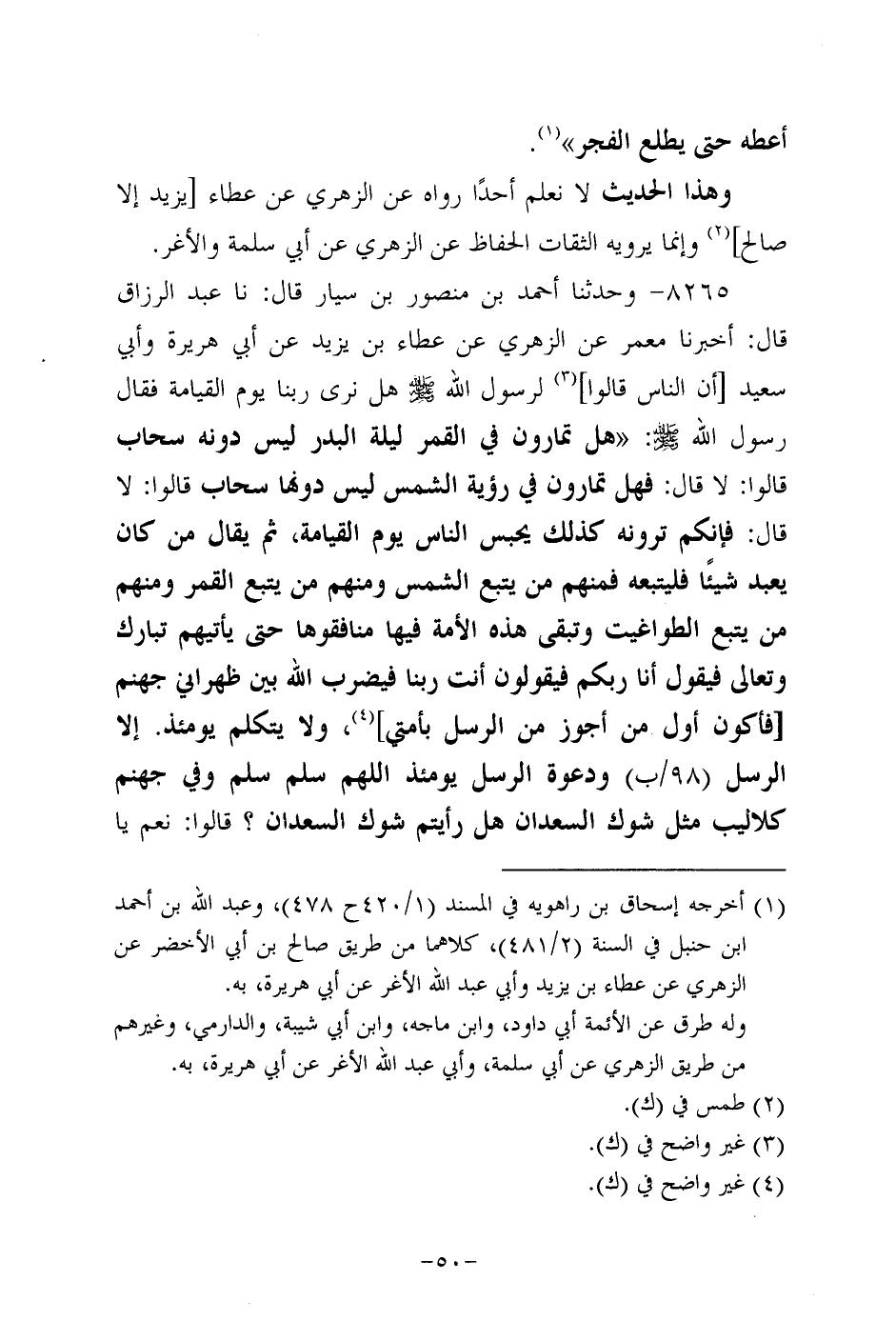 8265- وحَدَّثنا أحمد بن منصور بن سيار، قَال: حَدَّثنا عَبد الرزاق، قال: أَخْبَرَنَا مَعْمَرٌ، عَنِ الزُّهْرِيِّ، عَنْ عَطَاءِ بْنِ يَزِيدَ، عَنْ أَبِي هُرَيْرَةَ , وَأَبِي سَعِيدٍ أَنَّ النَّاسَ قَالُوا لِرَسُولِ اللهِ صَلَّى الله عَلَيه وَسَلَّم، هَلْ نَرَى رَبَّنَا يَوْمَ الْقِيَامَةِ؟ فَقَالَ رَسُولُ اللهِ صَلَّى اللَّهُ عَلَيه وَسَلَّم: هَلْ تُمَارونَ فِي الْقَمَرِ لَيْلَةَ الْبَدْرِ لَيْسَ دُونَهُ سَحَابُ؟ قَالُوا: لاَ , قَالَ: فَهَلْ تُمَارونَ فِي رُؤْيَةِ الشَّمْسِ لَيْسَ دُونَهَا سَحَابٌ؟ قَالُوا: لاَ، قَالَ: فَإِنَّكُمْ تَرَوْنَهُ كَذَلِكَ , يَحْبِسُ النَّاسَ يَوْمَ الْقِيَامَةِ ثُمَّ يُقَالُ: مَنْ كَانَ يَعْبُدُ شَيْئًا فَلْيَتْبَعْهُ فَمِنْهُمْ مَنْ يَتَّبِعُ الشَّمْسَ وَمِنْهُمْ مَنْ يَتَّبِعُ الْقَمَرَ وَمِنْهُمْ مَنْ يَتَّبِعُ الطَّوَاغِيتَ ,