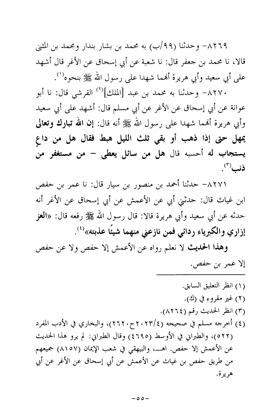 8270- وحَدَّثنا به مُحَمد بن عَبد الملك القرشي، قَال: حَدَّثنا أَبُو عَوَانة، عَن أبي إسحاق، عَن الأغر، عَن أبي مسلم قال: أشهد على أبي سَعِيد، وأبي هُرَيرة أنهما شهدا عَلَى رَسُولِ اللَّهِ صَلَّى اللَّهُ عَلَيه وَسَلَّم؛ أَنَّه قال: إن الله تبارك وتعالى يمهل حتى إذا ذهب، أو بقى ثلث الليل هبط فقال هل من داع يستجاب له، أَحسَبُهُ قال: هل من سائل يعطى ـ من مستغفر من ذنب.