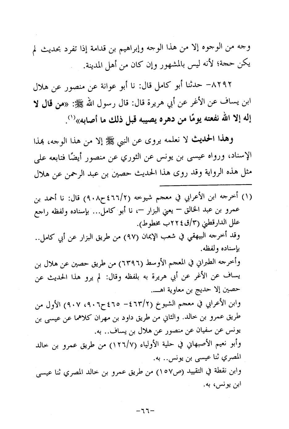 8292- حَدَّثنا أَبُو كامل، قَال: حَدَّثنا أَبُو عَوَانة، عَن مَنْصُورٍ عَنْ هِلالِ بْنِ يِسَافٍ عَنِ الأغر، عَن أبي هُرَيرة، قَالَ: قَالَ رَسُول اللهِ صَلَّى اللَّهُ عَلَيه وَسَلَّم: من قال لا إله إلاَّ الله نفعته يوما من دهره يصيبه قبل ذلك ما أصابه.