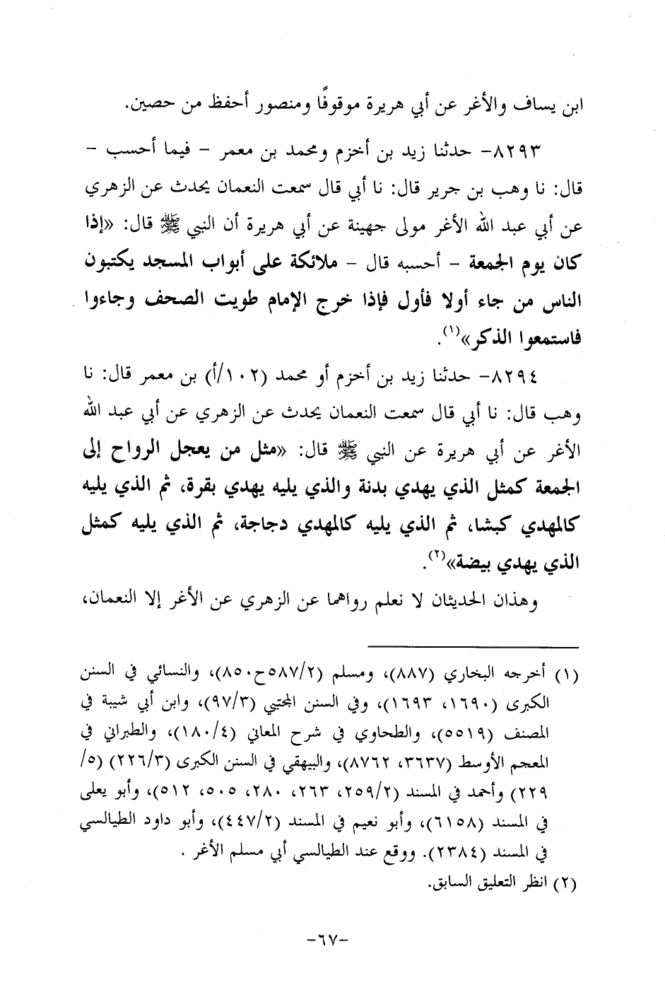 8293- حَدَّثنا زيد بن أخزم، ومُحَمد بن مَعْمَر - فيما أحسب - قَال: حَدَّثنا وهب بن جرير، قَال: حَدَّثنا أبي، قَال: سَمعتُ النعمان يحدث عَن الزُّهْرِيّ، عَن أبي عَبد الله الأغر مولى جهينة، عَن أبي هُرَيرة؛ أَنَّ النَّبِيّ صَلَّى اللَّهُ عَلَيه وَسَلَّم قَالَ: إذا كان يوم الجمعة، أَحسَبُهُ قال: ملائكة على أبواب المسجد يكتبون الناس من جاء أولا فأول فإذا خرج الإمام طويت الصحف وجاؤُوا فاستمعوا الذكر.