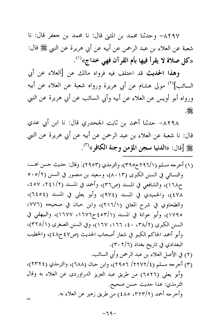 8297- وحَدَّثَنا مُحَمَّدُ بْنُ الْمُثَنَّى، قَال: حَدَّثنا مُحَمَّدُ بْنَ جَعْفَرٍ، قَال: حَدَّثنا شُعْبَةُ، عَن العلاء بن عَبد الرحمن، عَن أَبِيه، عَن أَبِي هُرَيرة، عَن النَّبِيّ صَلَّى الله عَلَيه وَسَلَّم قال: كل صلاة لاَ يُقْرَأُ فيها بأم القرآن فهي خداج.