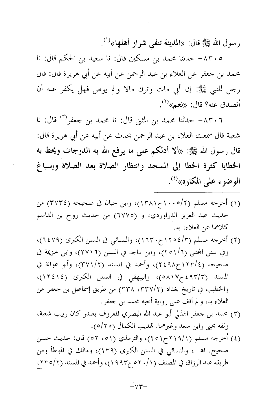 8306- حَدَّثَنا مُحَمَّدُ بْنُ الْمُثَنَّى، قَال: حَدَّثنا مُحَمَّدُ بْنَ جَعْفَرٍ، قَال: حَدَّثنا شعبة، قَال: سَمعتُ العلاء بن عَبد الرحمن يحدث عَن أَبِيه، عَن أبي هُرَيرة، قَالَ: قَالَ رَسُول اللهِ صَلَّى اللَّهُ عَلَيه وَسَلَّم ألا أدلكم على ما يرفع الله به الدرجات ويحط به الخطايا كثرة الخطا إلى المسجد وانتظار الصلاة بعد الصلاة وإسباغ الوضوء على المكاره.