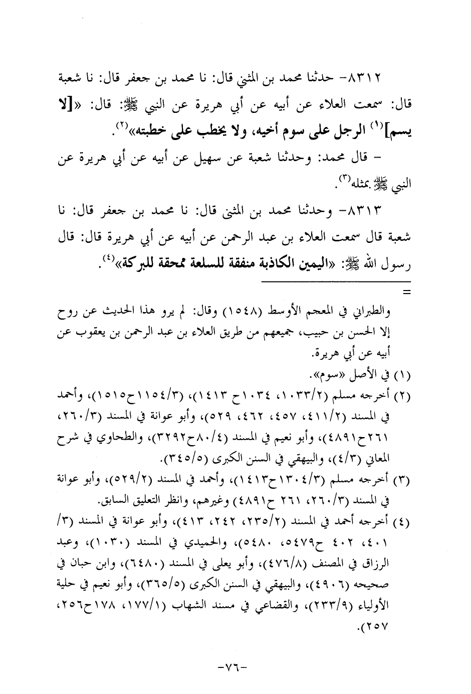 8312- حَدَّثَنا مُحَمَّدُ بْنُ الْمُثَنَّى، قَال: حَدَّثنا مُحَمَّدُ بْنَ جَعْفَرٍ، قَال: حَدَّثنا شعبة، قال: سَمِعْتُ العلاء، عَن أَبِيه، عَن أَبِي هُرَيرة، عَن النَّبِيّ صَلَّى الله عَلَيه وَسَلَّم، قَال: لاَ يسم الرجل على سوم أخيه، ولاَ يخطب على خطبته.