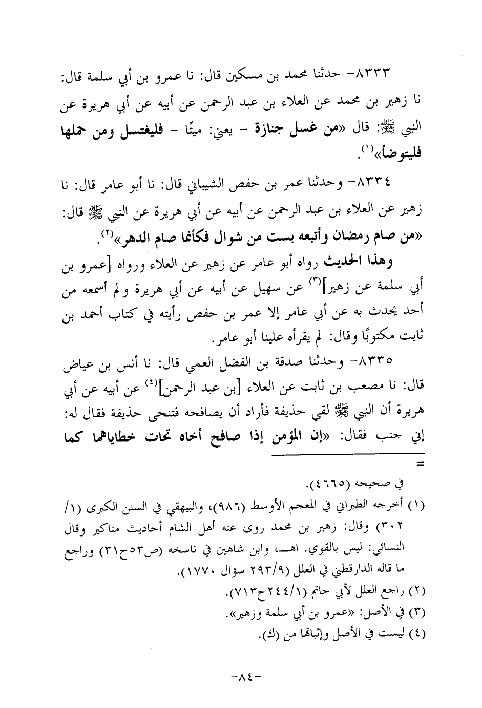 8333- حَدَّثنا مُحَمد بن مسكين، قَال: حَدَّثنا عَمْرو بن أبي سَلَمَة، قَال: حَدَّثنا زهير بن مُحَمد، عَن العلاء بن عَبد الرحمن، عَن أَبِيه، عَن أَبِي هُرَيرة، عَن النَّبِيّ صَلَّى الله عَلَيه وَسَلَّم قال: من غسل جنازة، يعني ميتًا، فليغتسل، وَمَنْ حملها فليتوضأ.