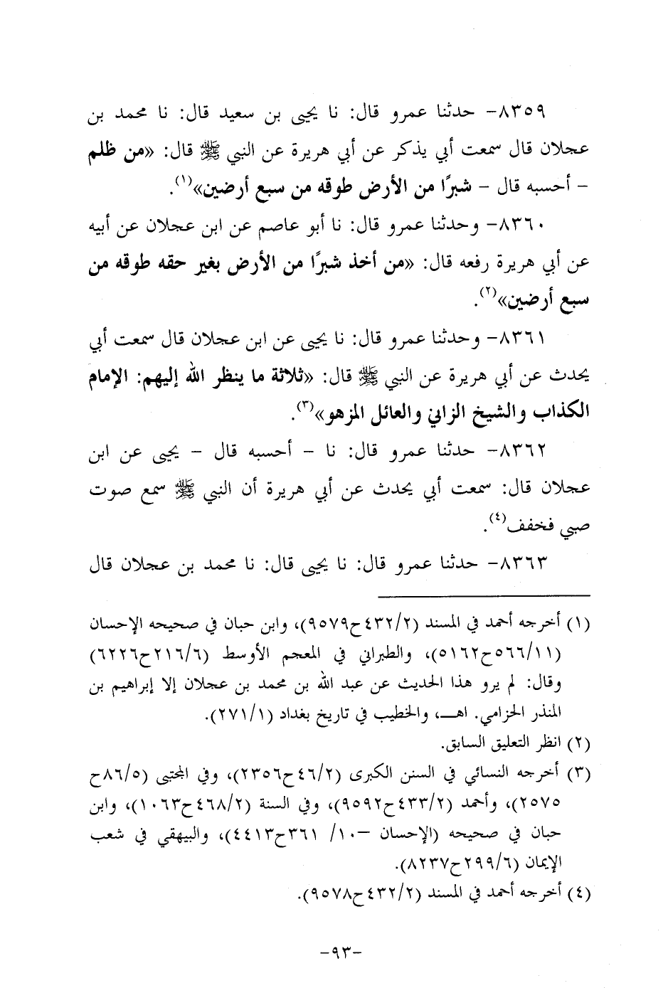 8360- وحَدَّثنا عَمْرو، قَال: حَدَّثنا أَبُو عَاصِم، عَن ابن عَجْلان، عَن أَبِيه، عَن أبي هُرَيرة رفعه قال: من أخذ شبرا من الأرض بغير حقه طوقه من سبع أرضين.