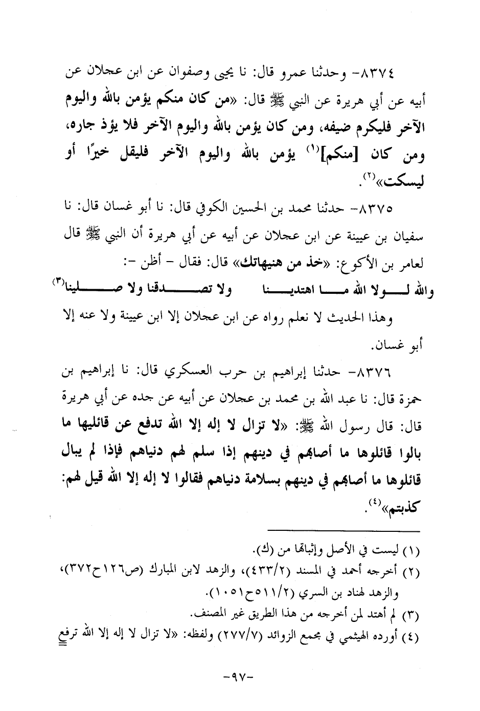 8374- وحَدَّثنا عَمْرو، قَال: حَدَّثنا يحيى وصفوان، عَن ابن عَجْلان، عَن أَبِيه، عَن أَبِي هُرَيرة، عَن النَّبِيّ صَلَّى اللَّهُ عَلَيه وَسَلَّم قَالَ: مَنْ كَانَ منكم يُؤْمِنُ بِاللَّهِ وَالْيَوْمِ الآخِرِ فَلْيُكْرِمْ ضَيْفَهُ، وَمَنْ كان يؤمن بالله واليوم الآخر فلا يؤذ جاره، وَمَنْ كان منكم يُؤْمِنُ بِاللَّهِ وَالْيَوْمِ الآخِرِ فَلْيَقُلْ خَيْرًا، أَوْ ليسكت.