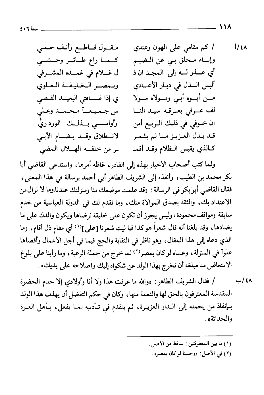 ولما كتب أصحاب الأخبار بهذه إلى القادر، غاظه أمرها، واستدعى القاضي أبا بكر محمد بن الطيب، وأنفذه إلى الشريف الطاهر أبي أحمد برسالة في هذا المعني، فقال القاضي أبو بكر في الرسالة: «قد علمت موضعك منا ومنزلتك عندنا وما لا نزال من الاعتداد بك، والثقة بصدق الموالاة منك، وما تقدم لك في الدولة العباسية من خدم سابقة ومواقف محمودة، وليس يجوز أن تكون على خليقة نرضاها ويكون والدك على ما يضادها، وقد بلغنا أنه قال شعرا هو كذا فيا ليت شعرنا [على] [1] أي مقام ذل أقام، وما الذي دعاه إلى هذا المقال، وهو ناظر في النقابة والحج فيما في أجل الأعمال وأقصاها علوا في المنزلة، وعساه لو كان بمصر [2] لما خرج من جملة الرعية، وما رأينا على بلوغ الامتعاض منا مبلغه أن تخرج بهذا الولد عن شكواه إليك وإصلاحه على يديك» .