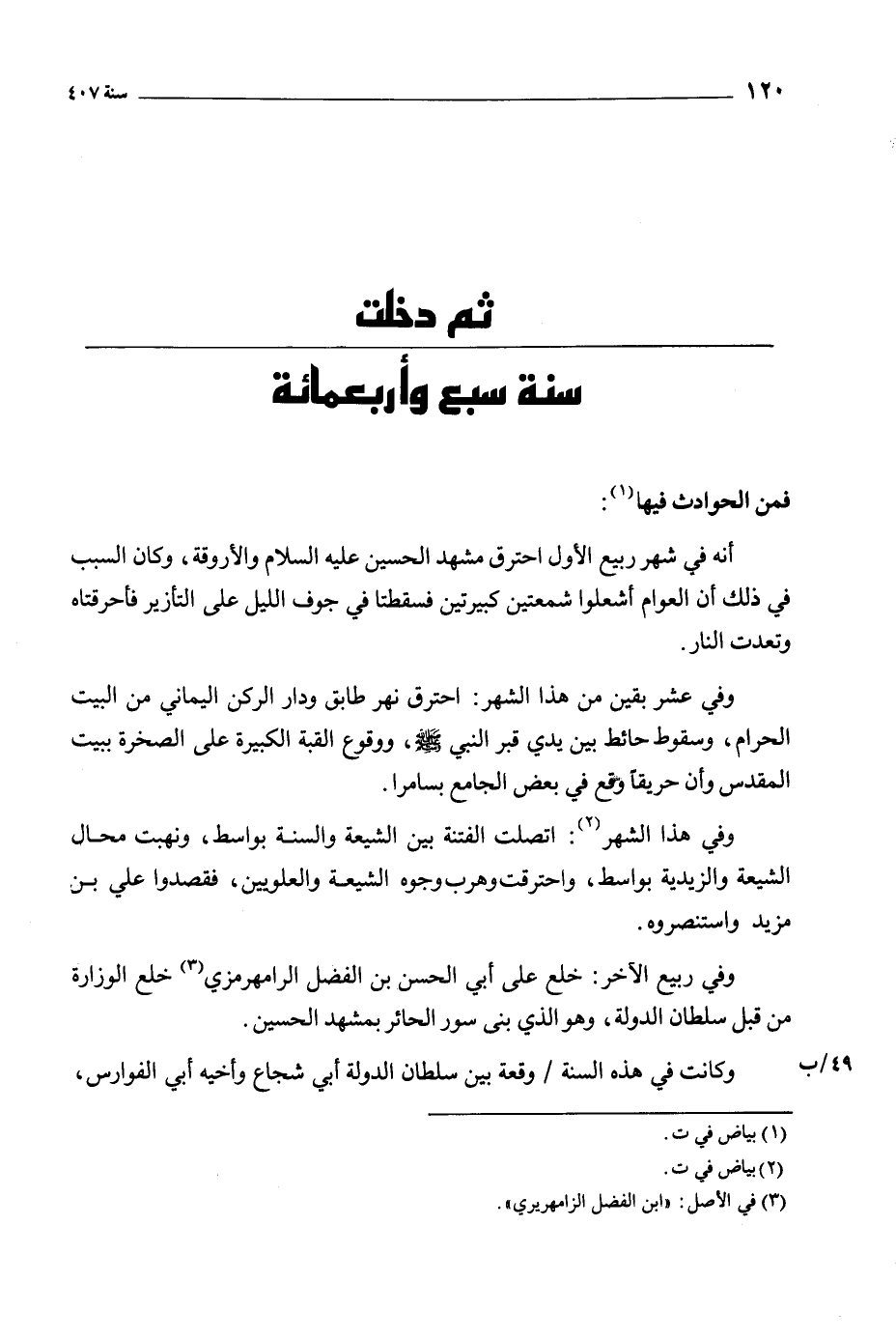 وفي ربيع الآخر: خلع على أبي الحسن بن الفضل الرامهرمزي [3] خلع الوزارة من قبل سلطان الدولة، وهو الذي بنى سور الحائر بمشهد الحسين.