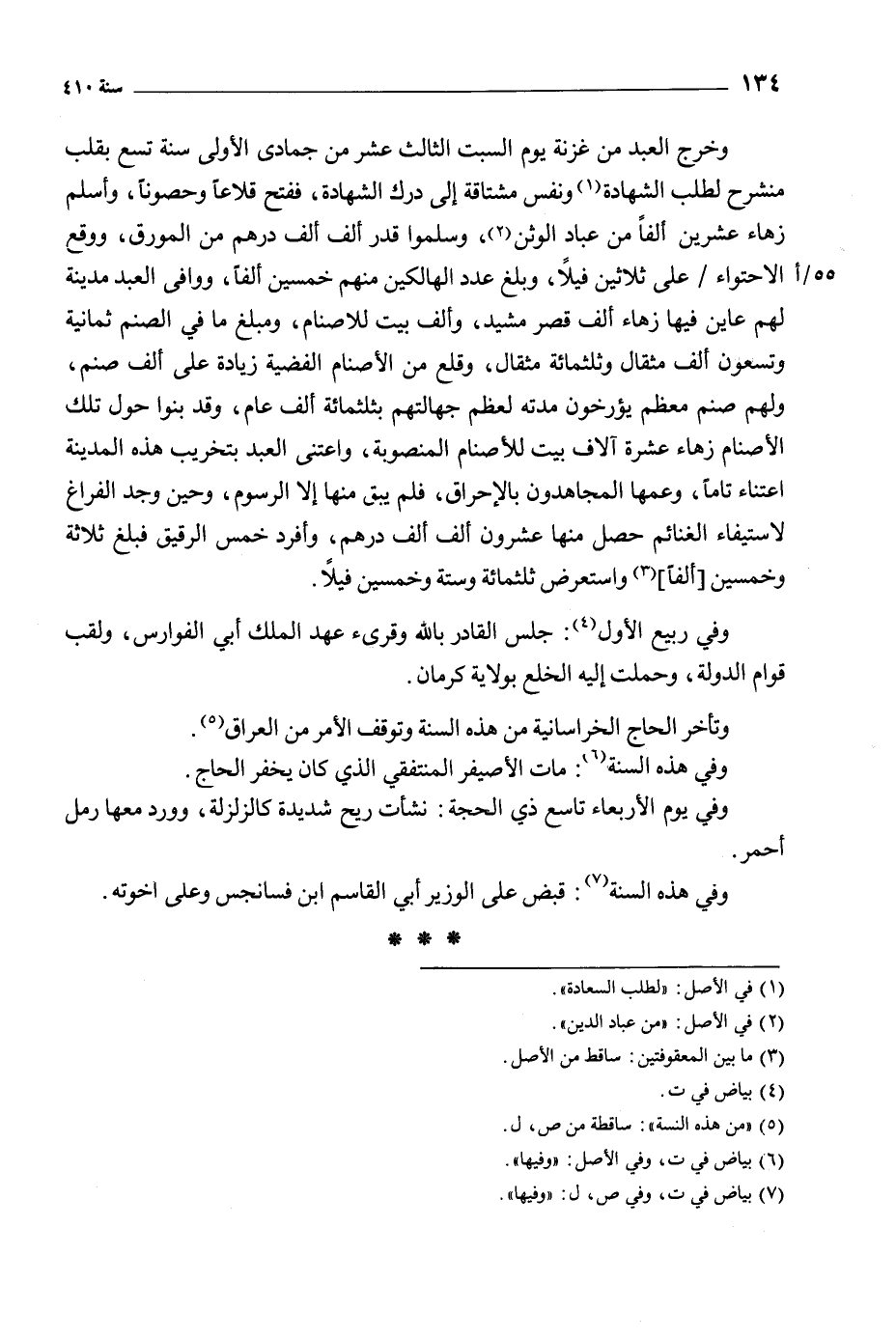 وخرج العبد من غزنة يوم السبت الثالث عشر من جمادى الأولى سنة تسع بقلب منشرح لطلب الشهادة [1] ونفس مشتاقة إلى درك الشهادة، ففتح قلاعا وحصونا، وأسلم زهاء عشرين ألفا من عباد الوثن [2] ، وسلموا قدر ألف ألف درهم من المورق، ووقع الاحتواء/ على ثلاثين فيلا، وبلغ عدد الهالكين منهم خمسين ألفا، ووافى العبد مدينة لهم عاين فيها زهاء ألف قصر مشيد، وألف بيت للأصنام، ومبلغ ما في الصنم ثمانية وتسعون ألف مثقال وثلاثمائة مثقال، وقلع من الأصنام الفضية زيادة على ألف صنم، ولهم صنم معظم يؤرخون مدته لعظم جهالتهم بثلاثمائة ألف عام، وقد بنوا حول تلك الأصنام زهاء عشرة آلاف بيت للأصنام المنصوبة، واعتنى العبد بتخريب هذه المدينة اعتناء تاما، وعمها المجاهدون بالإحراق، فلم يبق منها إلا الرسوم، وحين وجد الفراغ لاستيفاء الغنائم حصل منها عشرون ألف ألف درهم، وأفرد خمس الرقيق فبلغ ثلاثة وخمسين [ألفا] [3] واستعرض ثلاثمائة وستة وخمسين فيلا.