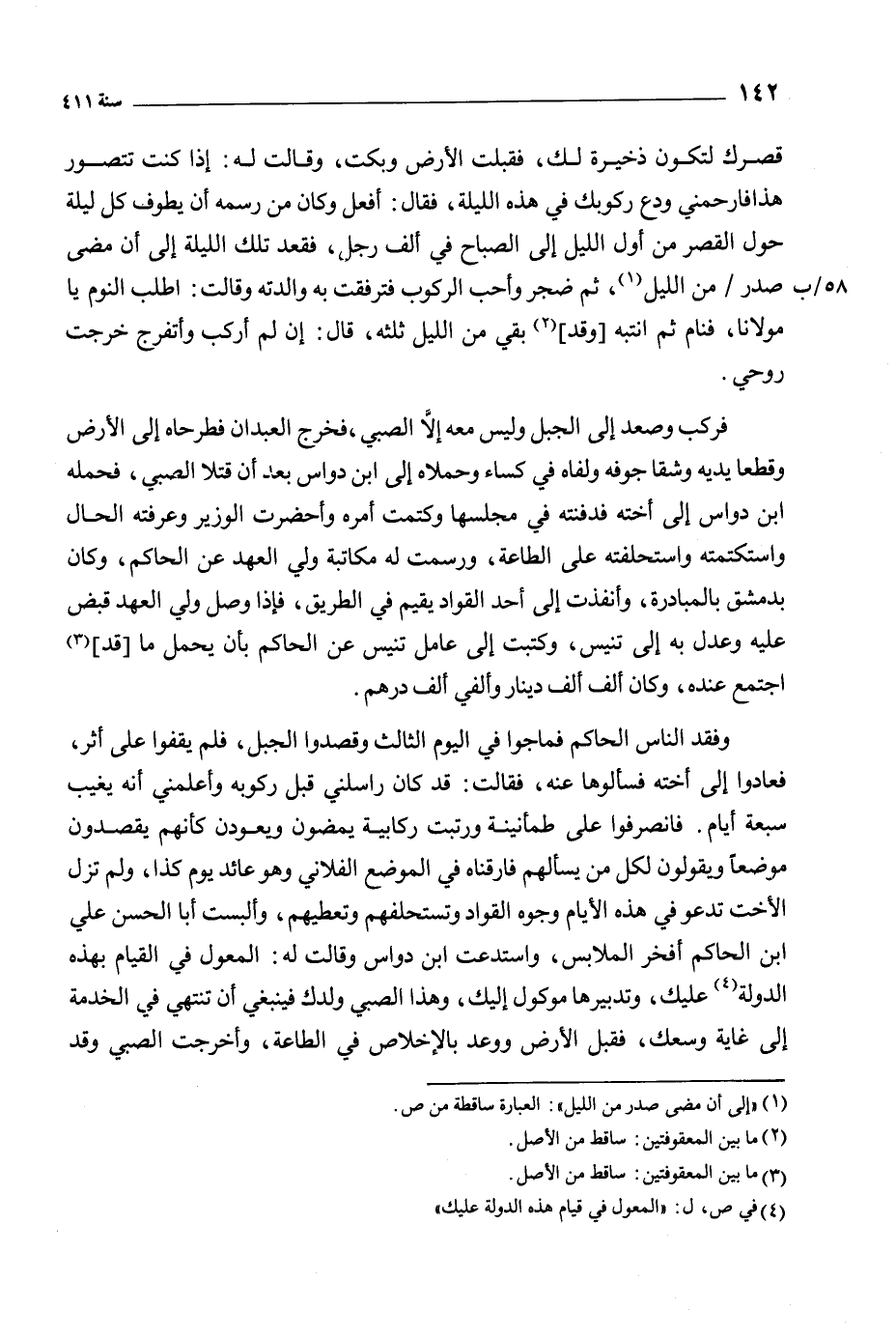 قصرك لتكون ذخيرة لك، فقبلت الأرض وبكت، وقالت له: إذا كنت تتصور هذا فارحمني ودع ركوبك في هذه الليلة، فقال: أفعل وكان من رسمه أن يطوف كل ليلة حول القصر من أول الليل إلى الصباح في ألف رجل، فقعد تلك الليلة إلى أن مضى صدر/ من الليل [1] ، ثم ضجر وأحب الركوب فترفقت به والدته وقالت: اطلب النوم يا مولانا، فنام ثم انتبه [وقد] [2] بقي من الليل ثلثه، قال: إن لم أركب وأتفرج خرجت روحي.