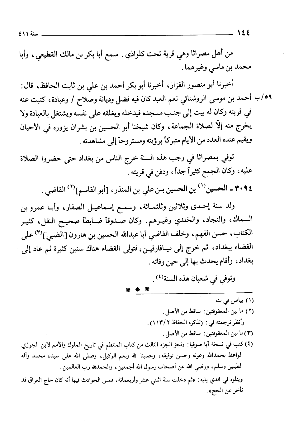 ويتلوه في الّذي يليه: «ثم دخلت سنة اثنتي عشر وأربعمائة، فمن الحوادث فيها أنه كان حاج العراق قد تأخر عن الحج» .