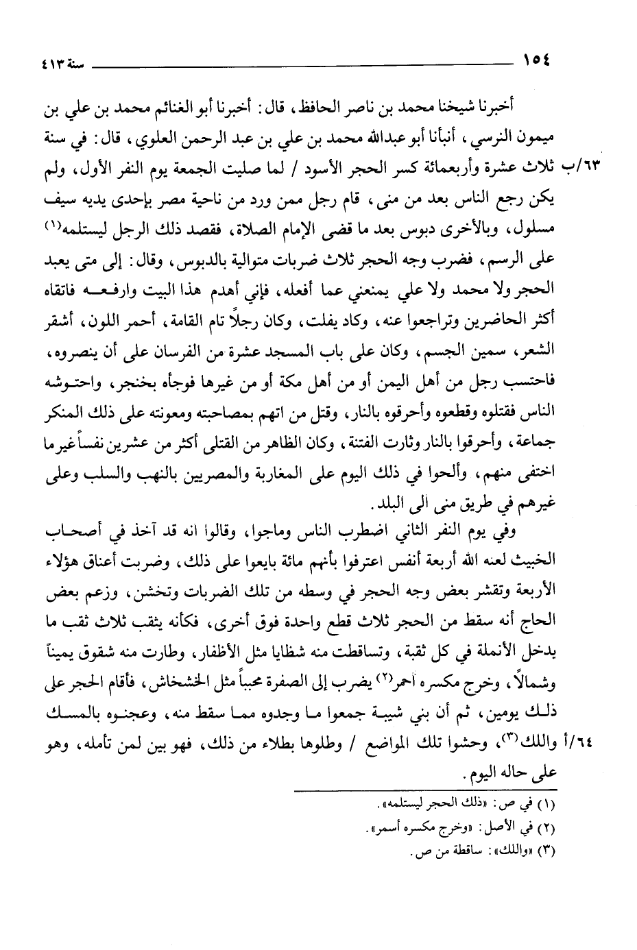 أخبرنا شيخنا محمد بن ناصر الحافظ، قَالَ: أَخْبَرَنَا أَبُو الْغَنَائِمِ مُحَمَّدُ بْنُ عَلِيِّ بن ميمون النرسي، أَنْبَأَنَا أَبُو عَبْد اللَّه مُحَمَّد بْن علي بن عبد الرحمن العلويّ، قال: في سنة ثلاث عشرة وأربعمائة كسر الحجر الأسود/ لما صليت الجمعة يوم النفر الأول، ولم يكن رجع الناس بعد من منى، قام رجل ممن ورد من ناحية مصر بإحدى يديه سيف مسلول، وبالأخرى دبوس بعد ما قضى الإمام الصلاة، فقصد ذلك الرجل ليستلمه [1] على الرسم، فضرب وجه الحجر ثلاث ضربات متوالية بالدبوس، وقال: إلى متى يعبد الحجر ولا محمد ولا علي يمنعني عما أفعله، فإنّي أهدم هذا البيت وارفعه فاتقاه أكثر الحاضرين وتراجعوا عنه، وكاد يفلت، وكان رجلا تام القامة، أحمر اللون، أشقر الشعر، سمين الجسم، وكان على باب المسجد عشرة من الفرسان على أن ينصروه، فاحتسب رجل من أهل اليمن أو من أهل مكة أو من غيرها فوجأه بخنجر، واحتوشه الناس فقتلوه وقطعوه وأحرقوه بالنار، وقتل من اتهم بمصاحبته ومعونته على ذلك المنكر جماعة، وأحرقوا بالنار وثارت الفتنة، وكان الظاهر من القتلى أكثر من عشرين نفسا غير ما اختفى منهم، وألحوا في ذلك اليوم على المغاربة والمصريين بالنهب والسلب وعلي غيرهم في طريق منى إلى البلد.