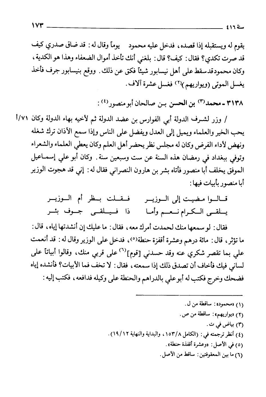 / وزر لشرف الدولة أبي الفوارس بن عضد الدولة ثم لأخيه بهاء الدولة وكان يحب الخير والعلماء ويميل إلى العدل ويفضل على الناس وإذا سمع الأذان ترك شغله ونهض لأداء الفرض وكان له مجلس نظر يحضر أهل العلم وكان يعطى العلماء والشعراء وتوفي ببغداد في رمضان هذه السنة عن ست وسبعين سنة. وكان أبو علي إسماعيل الموفق يخلف أبا منصور فأتاه بشر بن هارون النصراني فقال له: إني قد هجوت الوزير أبا منصور بأبيات فيها: