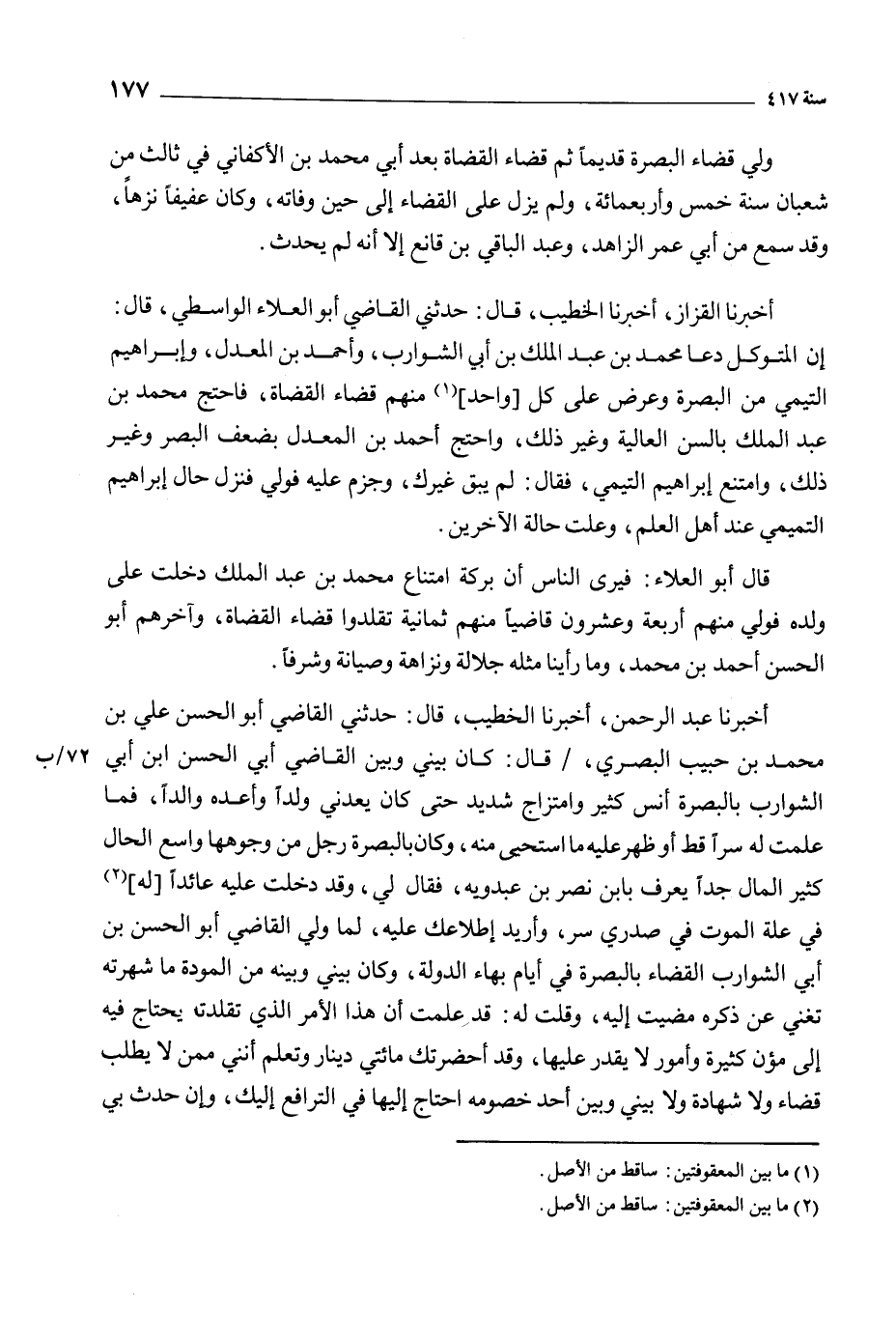 أخبرنا عبد الرحمن، أخبرنا الخطيب، قال: حدثني القاضي أبو الحسن علي بن محمد بن حبيب البصري، قال: كان بيني وبين القاضي أبي الحسن ابن أبي الشوارب بالبصرة أنس كثير وامتزاج شديد حتى كان يعدني ولدا وأعده والدا، فما علمت له سرا قط أو ظهر عليه ما استحيى منه، وكان بالبصرة رجل من وجوهها واسع الحال كثير المال جدا يعرف بابن نصر بن عبدويه، فقال لي، وقد دخلت عليه عائدا [له] [2] في علة الموت في صدري سر، وأريد اطلاعك عليه، لما ولى القاضي أبو الحسن بن أبي الشوارب القضاء بالبصرة في أيام بهاء الدولة، وكان بيني وبينه من المودة ما شهرته تغنى عن ذكره مضيت إليه، وقلت له: قد علمت أن هذا الأمر الّذي تقلدتا يحتاج فيه إلى مؤن كثيرة وأمور لا يقدر عليها، وقد أحضرتك مائتي دينار وتعلم أنني ممن لا يطلب قضاء ولا شهادة ولا بيني وبين أحد خصومة احتاج إليها في الترافع إليك، وإن حدث بي