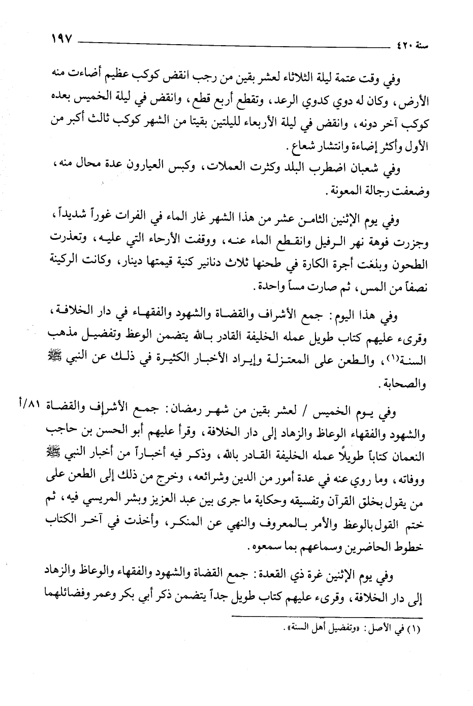 وفي هذا اليوم: جمع الأشراف والقضاة والشهود والفقهاء في دار الخلافة، وقرئ عليهم كتاب طويل عمله الخليفة القادر باللَّه يتضمن الوعظ وتفضيل مذهب السنة [1] ، والطعن على المعتزلة وإيراد الأخبار الكثيرة في ذلك عن النبي صلى الله عليه وسلم والصحابة.