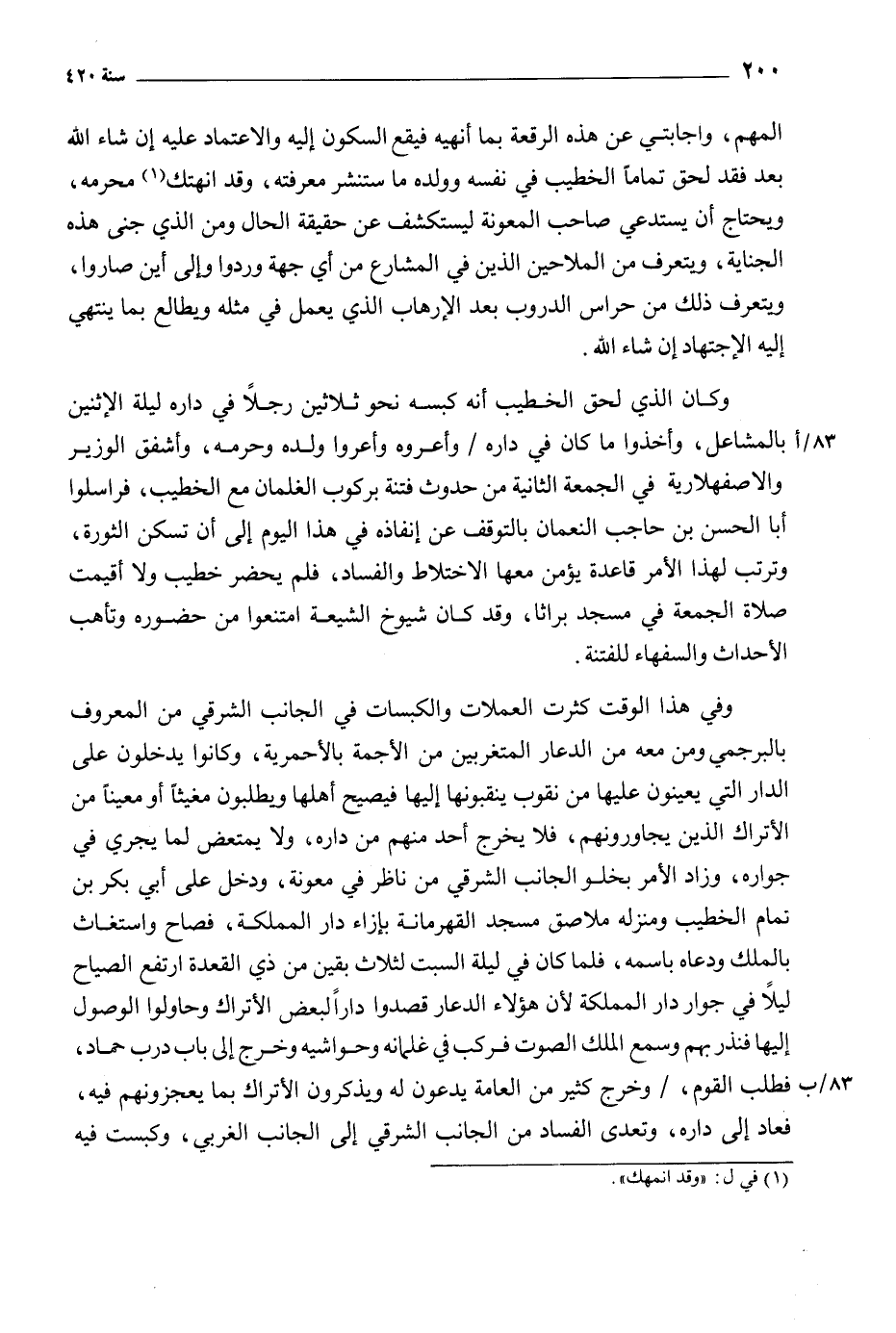 المهم، وإجابتي عن هذه الرقعة بما أنهيه فيقع السكون إليه والاعتماد عليه إن شاء الله بعد فقد لحق تماما الخطيب في نفسه وولده ما ستنشر معرفته، وقد انهتك [1] محرمه، ويحتاج أن يستدعي صاحب المعونة ليستكشف عن حقيقة الحال ومن الذي جنى هذه الجناية، ويتعرف من الملاحين الذين في المشارع من أي جهة وردوا وإلى أين صاروا، ويتعرف ذلك من حراس الدروب بعد الإرهاب الذي يعمل في مثله ويطالع بما ينتهي إليه الاجتهاد أن شاء الله.