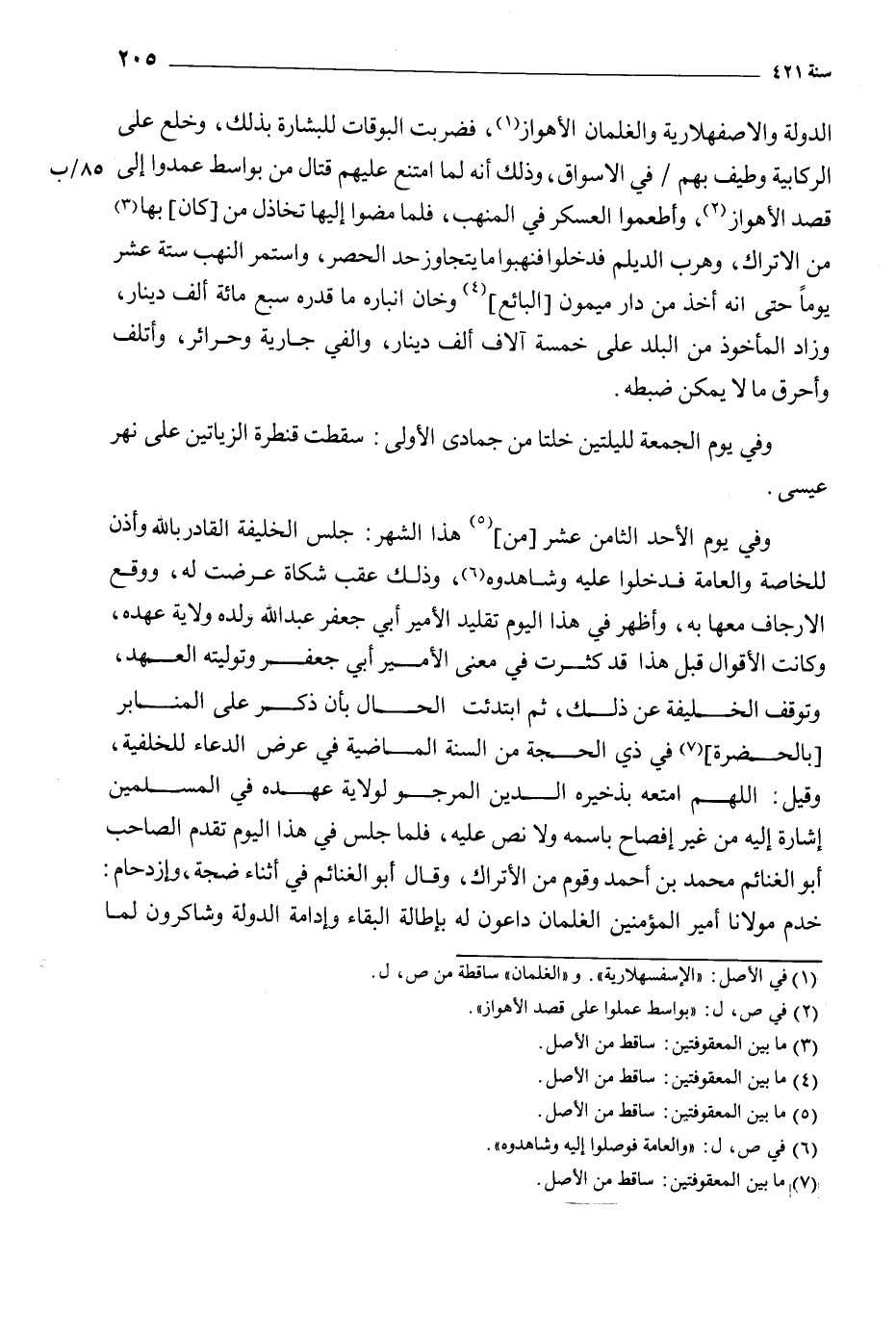 وفي يوم الأحد الثامن عشر [من] [5] هذا الشهر: جلس الخليفة القادر باللَّه وأذن للخاصة والعامة فدخلوا عليه وشاهدوه [6] ، وذلك عقب شكاة عرضت له، ووقع الإرجاف معها به، وأظهر في هذا اليوم تقليد الأمير أبي جعفر عبد الله ولده ولاية عهده، وكانت الأقوال قبل هذا قد كثرت في معنى الأمير أبي جعفر وتوليته العهد، وتوقف الخليفة عن ذلك، ثم ابتدئت الحال بأن ذكر على المنابر [بالحضرة] [7] في ذي الحجة من السنة الماضية في عرض الدعاء للخلفية، وقيل: اللَّهمّ أمتعه بذخيرة الدين المرجو لولاية عهده في المسلمين إشارة إليه من غير إفصاح باسمه ولا نص عليه، فلما جلس في هذا اليوم تقدم الصاحب أبو الغنائم محمد بن أحمد وقوم من الأتراك، وقال أبو الغنائم في أثناء ضجة، وازدحام: