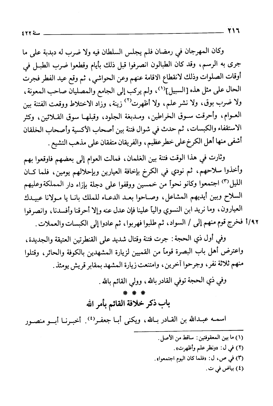 وكان المهرجان في رمضان فلم يجلس السلطان فيه ولا ضرب له دبدبة على ما جرى به الرسم، وقد كان الطبالون انصرفوا قبل ذلك بأيام وقطعوا ضرب الطبل في أوقات الصلوات وذلك لانقطاع الإقامة عنهم وعن الحواشي، ثم وقع عيد الفطر فجرت الحال على مثل هذه [السبيل] [1] ، ولم يركب إلى الجامع والمصليان صاحب المعونة، ولا ضرب بوق، ولا نشر علم، ولا أظهرت [2] زينة، وزاد الاختلاط ووقعت الفتنة بين العوام، وأحرقت سوق الخراطين، ومدبغة الجلود، وقبلها سوق القلائين، وكثر الاستقفاء والكبسات، ثم حدث في شوال فتنة بين أصحاب الأكسية وأصحاب الخلقان أشفى منها أهل الكرخ على خطر عظيم، والفريقان متفقان على مذهب التشيع.