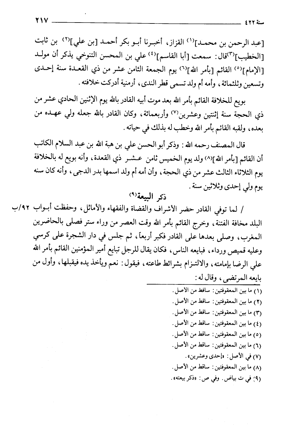 قال المصنف رحمه الله: وذكر أبو الحسن علي بن هبة الله بن عبد السلام الكاتب أن القائم [بأمر الله] [8] ولد يوم الخميس ثامن عشر ذي القعدة، وأنه بويع له بالخلافة يوم الثلاثاء الثالث عشر من ذي الحجة، وأن أمه أم ولد اسمها بدر الدجى، وأنه كان سنة يوم ولي إحدى وثلاثين سنة.