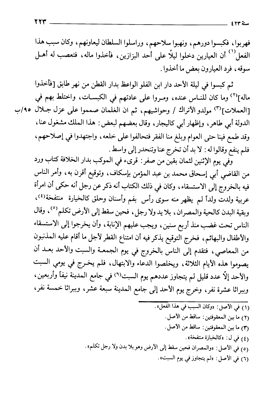 وفي يوم الاثنين لثمان بقين من صفر: قرئ في الموكب بدار الخلافة كتاب ورد من القاضي أبي إسحاق محمد بن عبد المؤمن بإسكاف، وتوقيع أقرن به، وأمر الناس فيه بالخروج إلى الاستسقاء، وكان في ذلك الكتاب أنه ذكر عن رجل أنه حكى أن امرأة عربية ولدت ولدا لم يظهر منه سوى رأس بفم وأسنان وحلق كالخيارة منتفخة [4] ، وبقية البدن كالحية والمصران، بلا يد ولا رجل، فحين سقط إلى الأرض تكلم [5] ، وقال الناس تحت غضب منذ أربع سنين، ويجب عليهم الإنابة، وأن يخرجوا إلى الاستسقاء والأطفال والبهائم، فخرج التوقيع يذكر فيه أن امتناع القطر لأجل ما أقام عليه المذنبون من المعاصي، فتقدم إلى الناس بالخروج في يوم الجمعة والسبت والأحد بعد أن يصوموا هذه الأيام الثلاثة، ويخلصوا الدعاء والابتهال، فلم يخرج في يومي السبت والأحد إلا عدد قليل لم يتجاوز عددهم يوم السبت [6] في جامع المدينة نيفا وأربعين، وببراثا عشرة نفر، وخرج يوم الأحد إلى جامع المدينة سبعة عشر، وببراثا خمسة نفر،