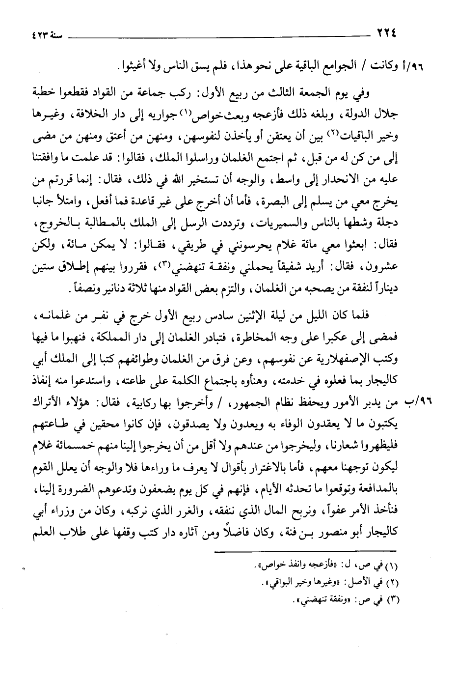 فلما كان الليل من ليلة الاثنين سادس ربيع الأول خرج في نفر من غلمانه، فمضى إلى عكبرا على وجه المخاطرة، فتبادر الغلمان إلى دار المملكة، فنهبوا ما فيها وكتب الإصفهلارية عن نفوسهم، وعن فرق من الغلمان وطوائفهم كتبا إلى الملك أبي كاليجار بما فعلوه في خدمته، وهنئوه باجتماع الكلمة علي طاعته، واستدعوا منه إنفاذ من يدبر الأمور ويحفظ نظام الجمهور، / وأخرجوا بها ركابية، فقال: هؤلاء الأتراك يكتبون ما لا يعقدون الوفاء به ويعدون ولا يصدقون، فإن كانوا محقين في طاعتهم فليظهروا شعارنا، وليخرجوا من عندهم ولا أقل من أن يخرجوا إلينا منهم خمسمائة غلام ليكون توجهنا معهم، فأما بالاغترار بأقوال لا يعرف ما وراءها فلا والوجه أن يعلل القوم بالمدافعة وتوقعوا ما تحدثه الأيام، فإنهم في كل يوم يضعفون وتدعوهم الضرورة إلينا، فنأخذ الأمر عفوا، ونربح المال الذي ننفقه، والغرر الذي نركبه، وكان من وزراء أبي كاليجار أبو منصور بن فنة، وكان فاضلا ومن آثاره دار كتب وقفها على طلاب العلم