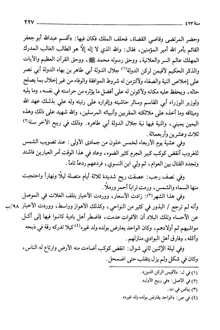 وحضر المرتضى وقاضي القضاة، فحلف الملك فكان فيها: «أقسم عبد الله أبو جعفر القائم بأمر الله أمير المؤمنين، فقال: والله الذي لا اله إلا هو الطالب الغالب المدرك المهلك عالم السر والعلانية، وحق رسوله محمد صلى الله عليه وسلم، وحق القرآن العظيم والآيات والذكر الحكيم لأقيمن لركن الدولة [1] جلال الدولة أبي طاهر بن بهاء الدولة أبي نصر على إخلاص النية والصفاء ولألتزمن له شروط الموافقة والوفاء من غير إخلال بما يصلح حاله، ويحفظ عليه مكانه ولأكونن له على أفضل ما يؤثره من حراسته في نفسه، وما يليه ولوزير الوزراء أبي القاسم وسائر حاشيته وإقراره على رتبته وله علي بذلك عهد الله وميثاقه وما أخذه على ملائكته المقربين وأنبيائه المرسلين، والله شهيد على ذلك وهذه اليمين يميني، والنية فيها نية جلال الدولة أبي طاهر» . وذلك في ربيع الآخر سنة [2] ثلاث وعشرين وأربعمائة.